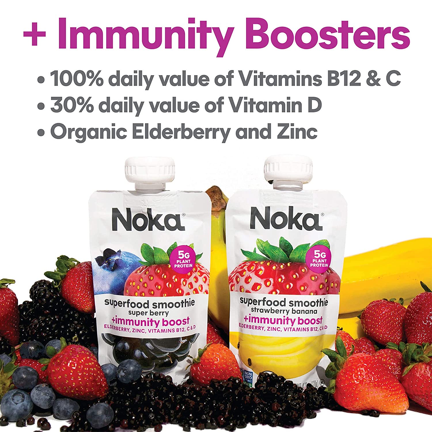 • Protein and Immune Support: Each strawberry smoothie pouch contains 5g of plant protein, flax seed and a vitamin and mineral blend that provides 100% of the daily value of Vitamins B12 and Vitamin C, 30% of Vitamin D and 50% of Zinc for the energy and nutrition you need.
