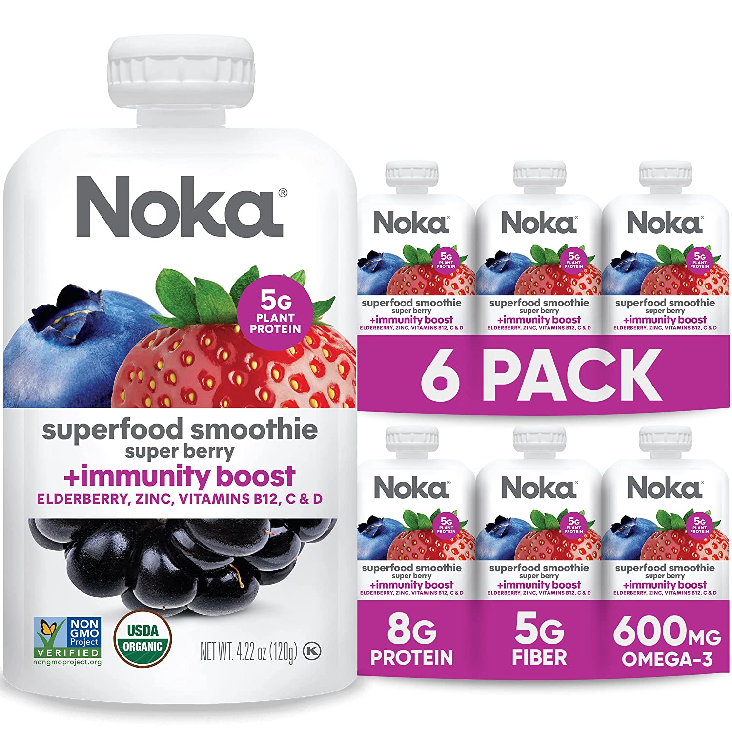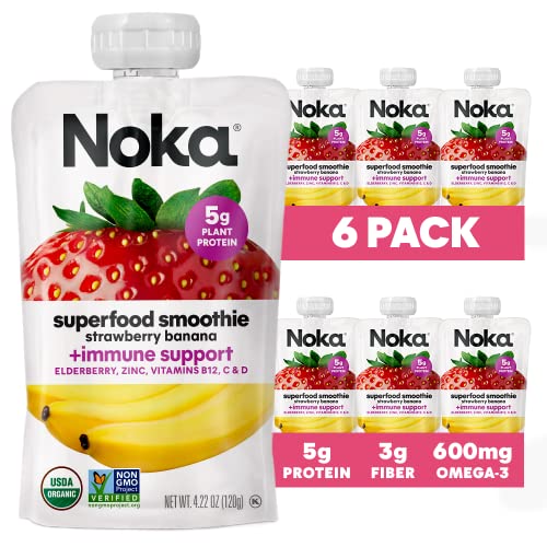Noka Superfood Fruit Smoothie Pouches, Super Berry with Immune Support, Healthy Snacks with Flax Seed, Elderberry and Plant Protein, Vegan and Gluten Free, Organic Squeeze Pouch, 4.22 oz, 6 Count