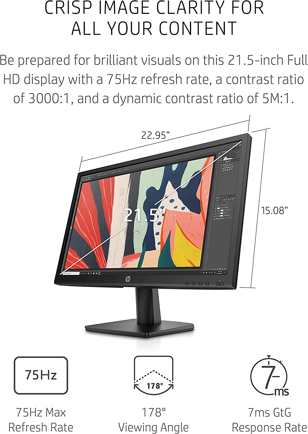 • FULL HD DISPLAY – Be prepared for brilliant visuals on this 21.5-inch Full HD display (1); enjoy colors that pop and superb black levels thanks to its 75Hz refresh rate, a contrast ratio of 3000:1, and a dynamic contrast ratio of 5M:1 (2).