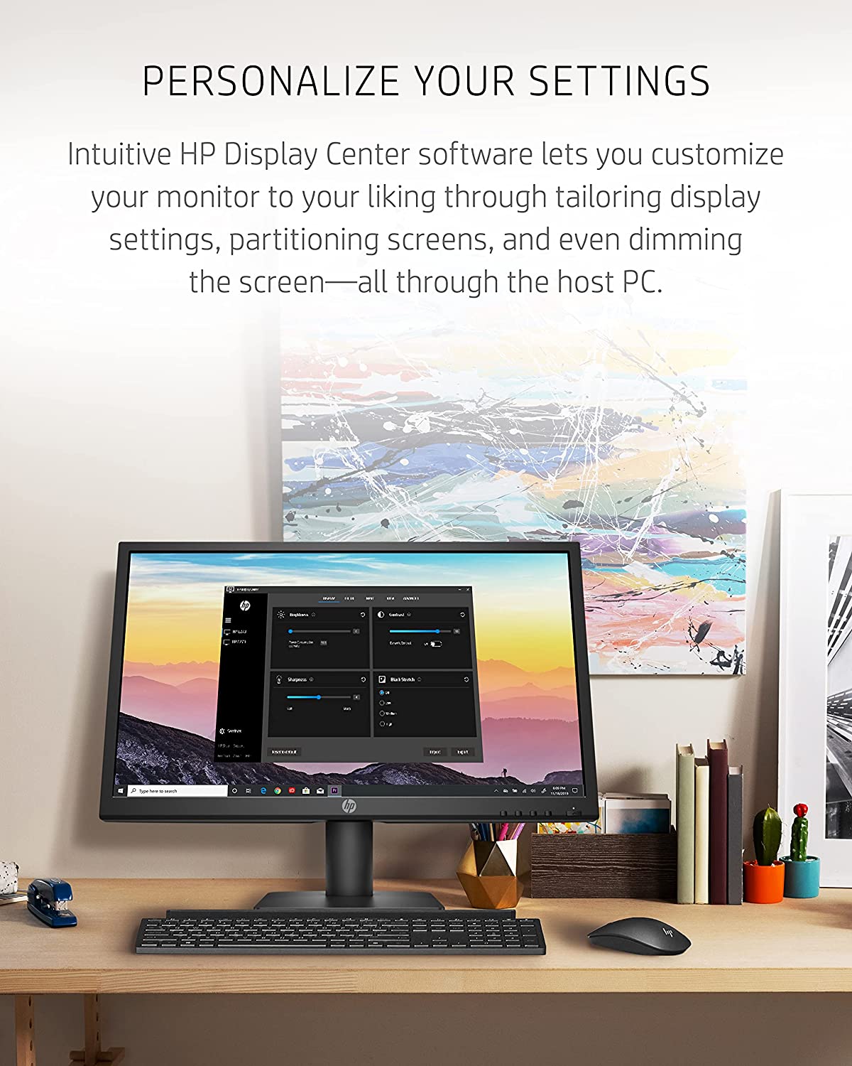 • PERSONALIZE YOUR SETTINGS – Intuitive HP Display Center software lets you customize your monitor to your liking through tailoring display settings, partitioning screens, and even dimming the screen—all through the host PC.