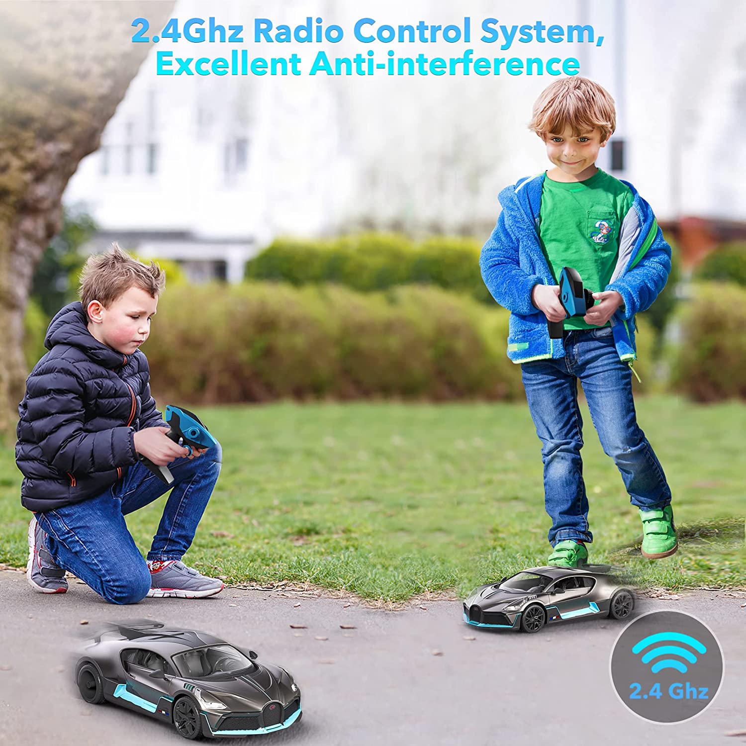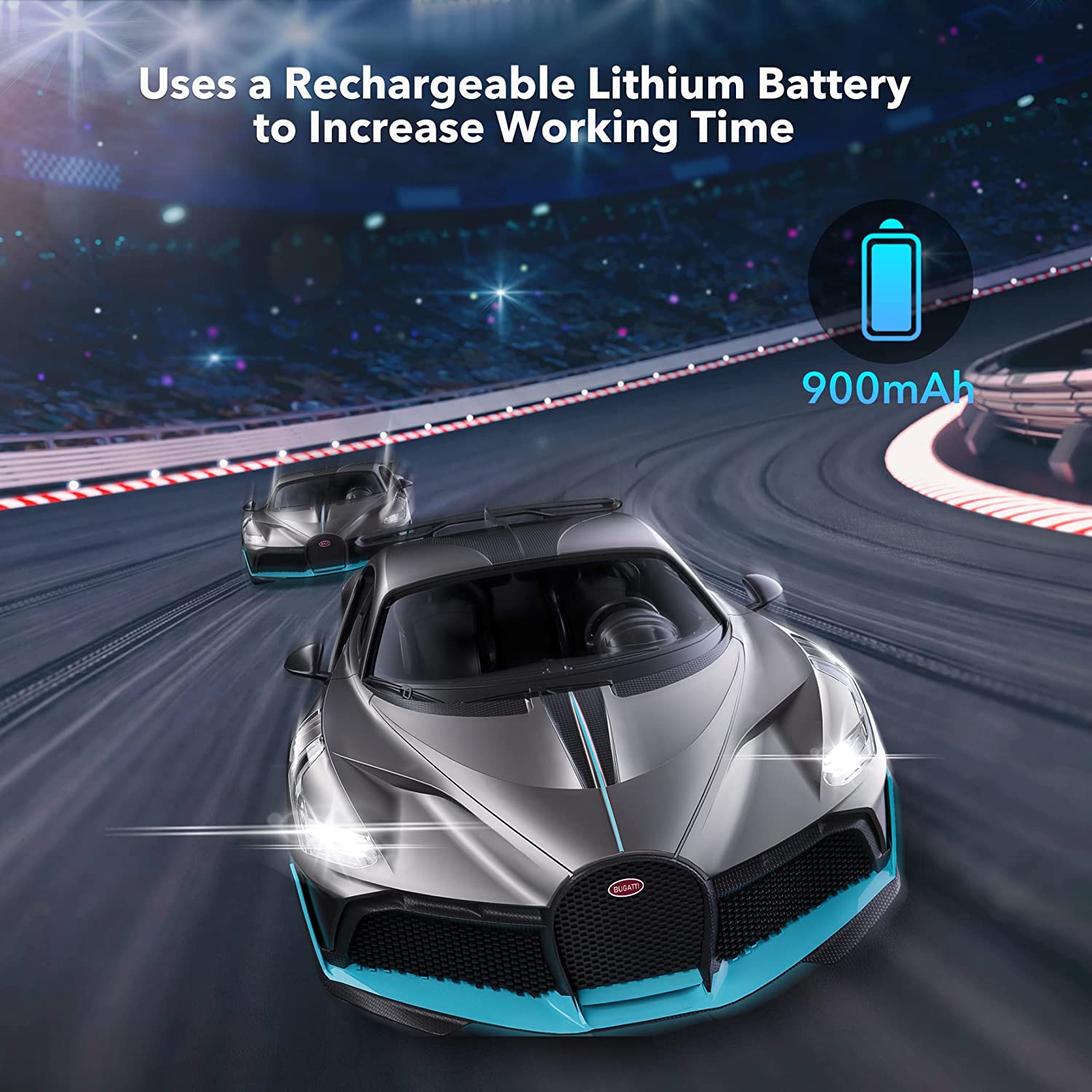 • Powerful controller: 2.4 GHz radio control system, with a built-in anti-jamming function. Many drivers can race together with no interference, so you can enjoy the fun of racing with your friends. We designed the detachable steering ring for right and left-handed drivers so that you can have the perfect operating experience controlling the Bugatti RC cars.