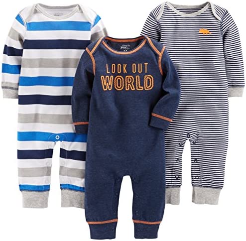 3-pack coveralls in soft cotton, lap shoulder design and snaps at the bottom.