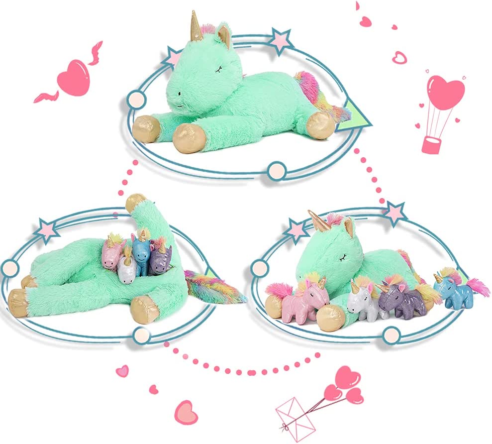 Tezituor 24 Inches Green Unicorn Plush Toy Set for Girls,4 Colorful Unicorns in Mommy Unicorn’s Belly,Unique Stuffed Unicorns Gifts for Children.