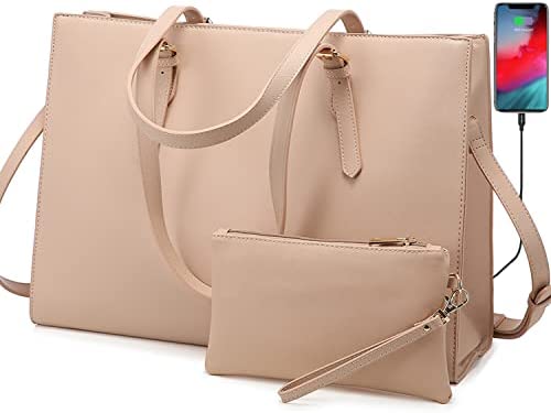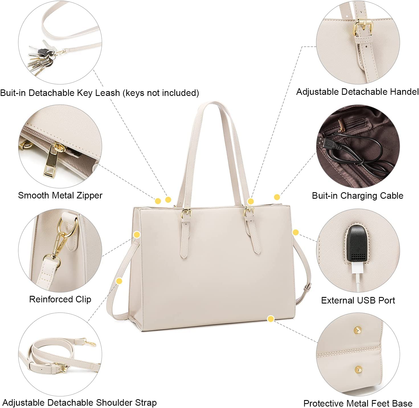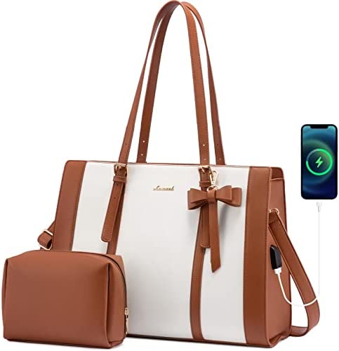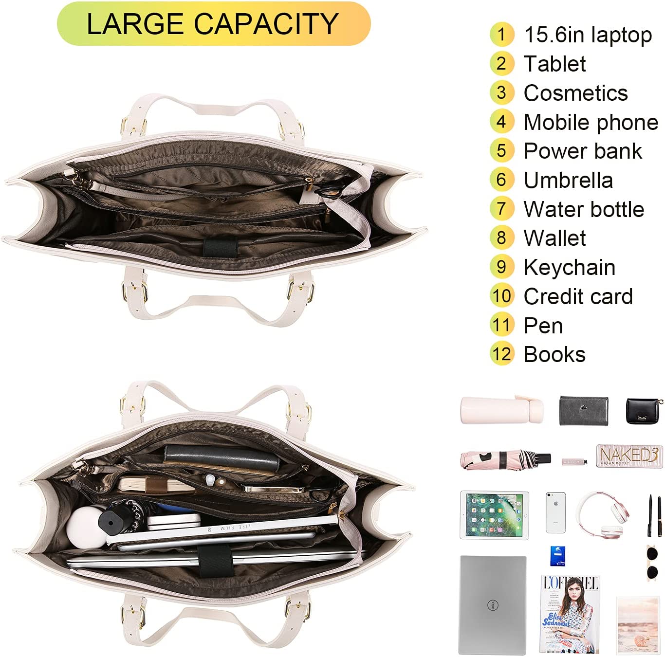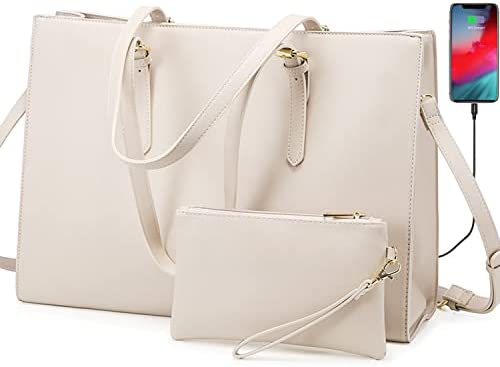 LOVEVOOK Laptop Bag for Women, Fashion Computer Tote Bag Large Capacity Handbag, Leather Shoulder Bag Purse Set, Professional Business Work Briefcase for Office Lady, 2PCs, 15.6-Inch, Beige White