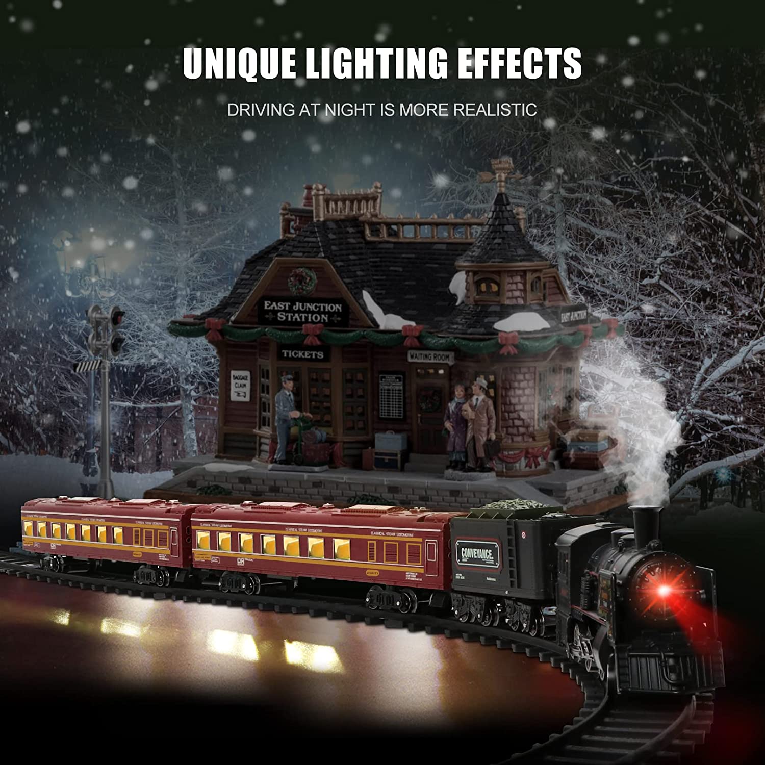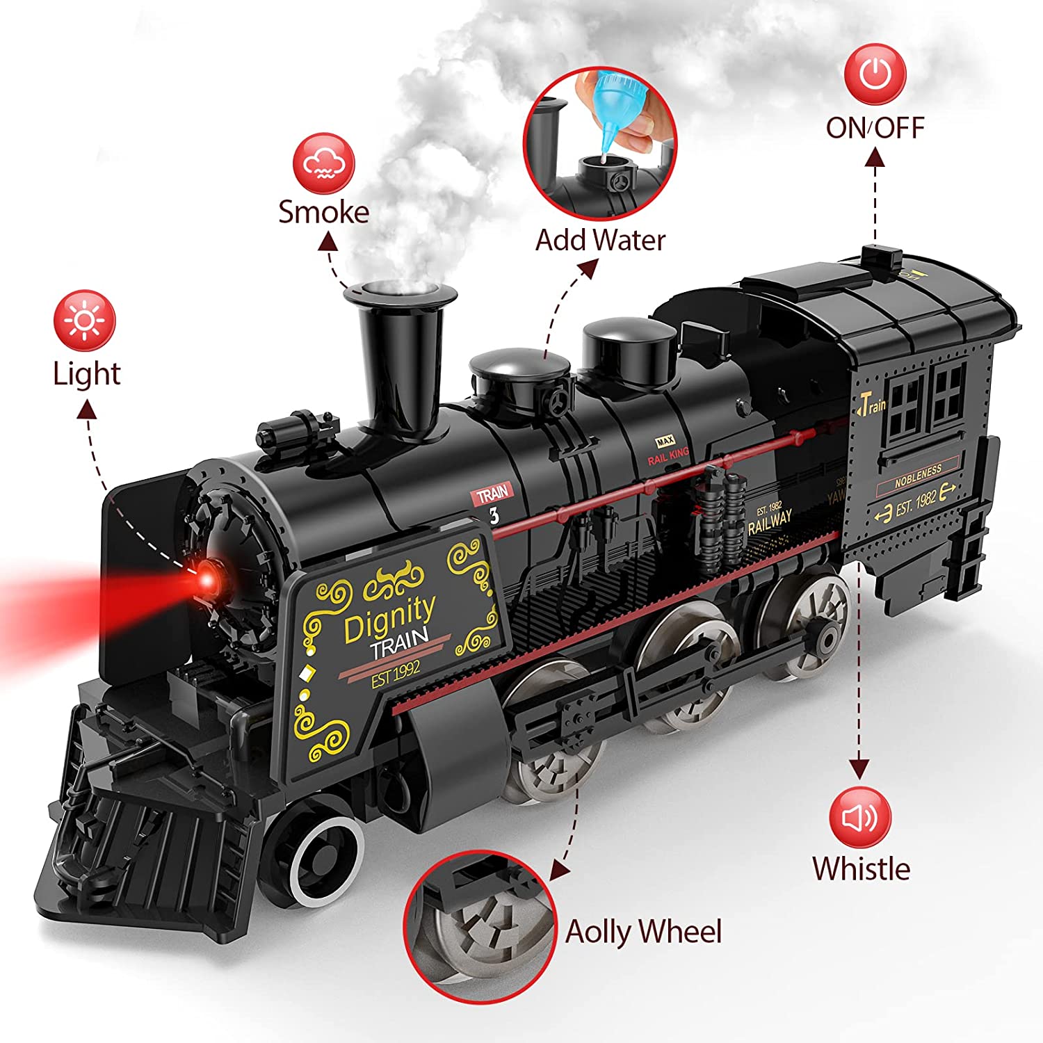 - ✨【LUMINOUS CARRIAGES & MULTIFUNCTIONAL LOCOMOTIVE】:Our electric train set restores all details of a real train. The exquisite train locomotive can make whistle sounds and lights, and using the water bottle that comes with the toy train sets to fill the water tank can also make it produce smoke.In addition, the 2 passenger carriages also have a light function. Turn on the bottom switch, warm light will fill the entire carriage. This makes the model train toy more realistic when driving at night.