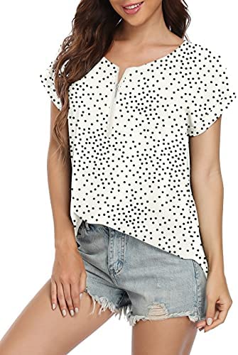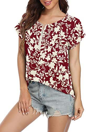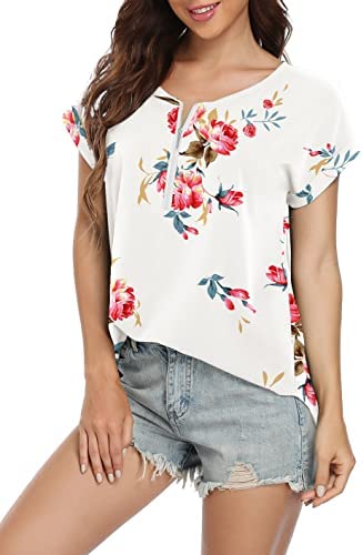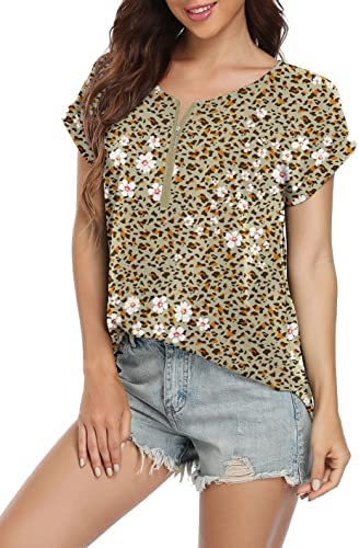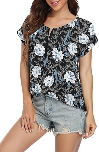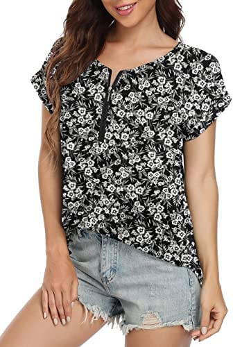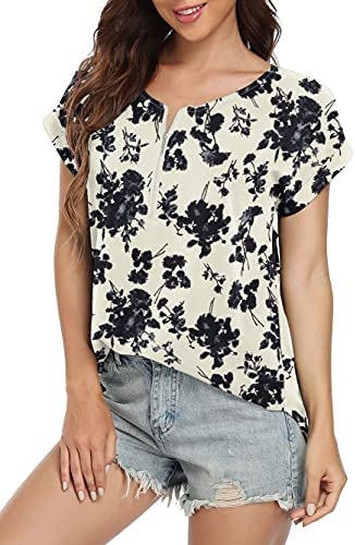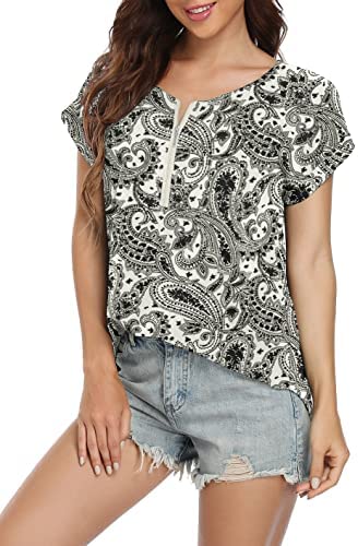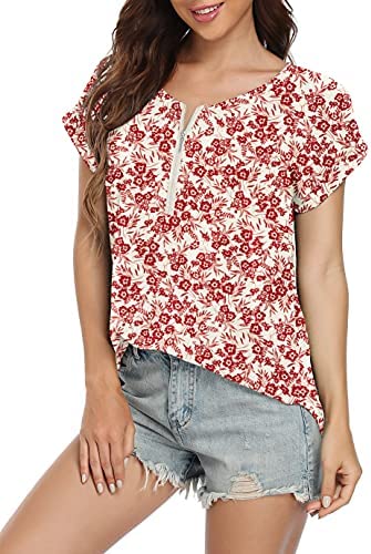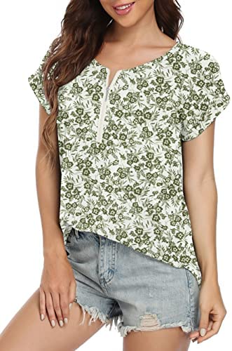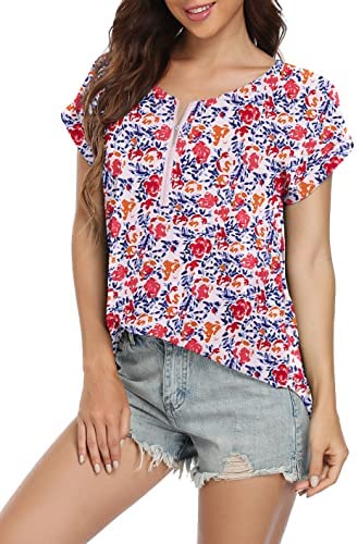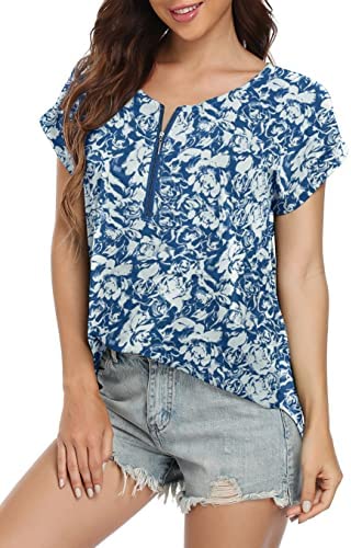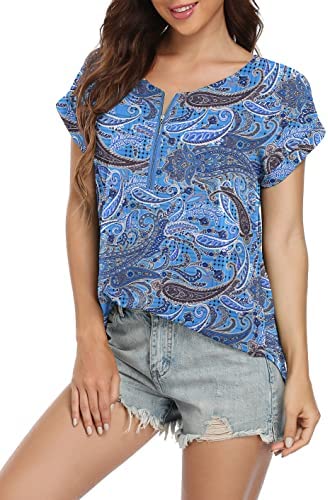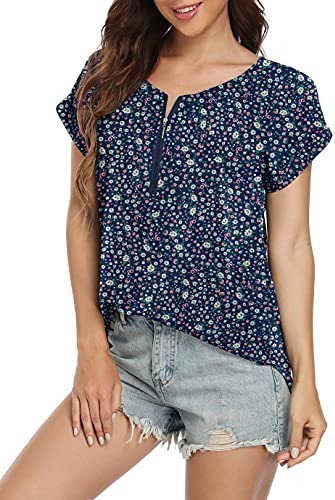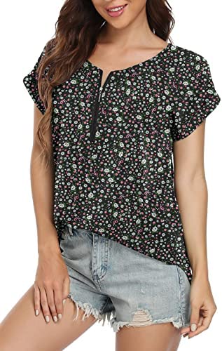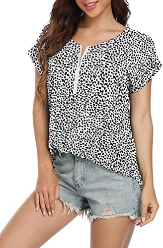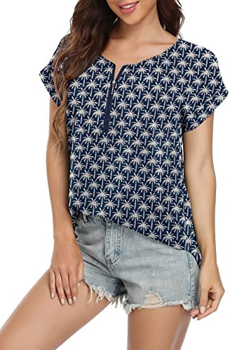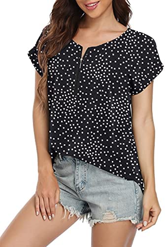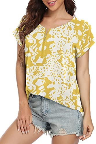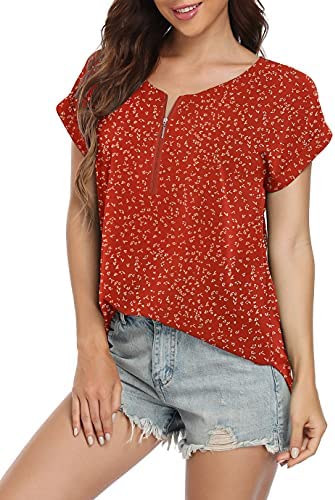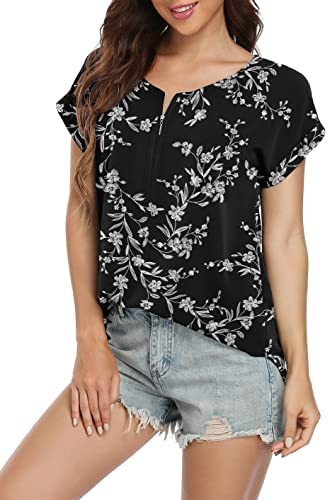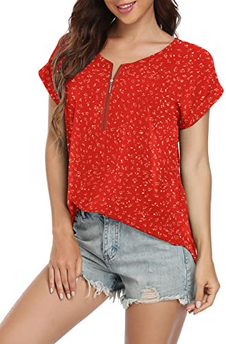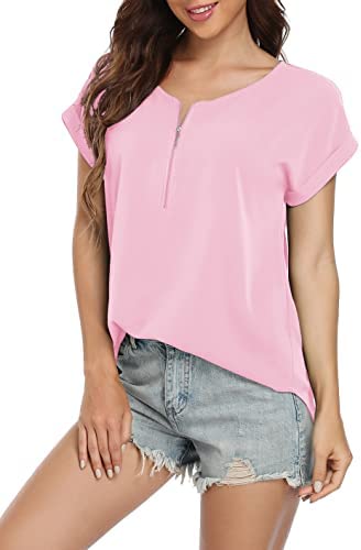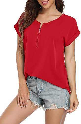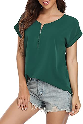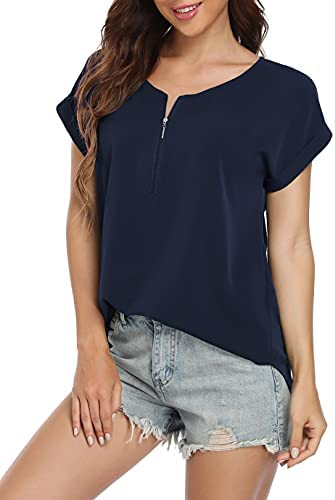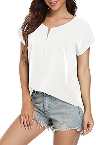 VIISHOW Women's Summer Casual Rolled Cuff Zip Half Placket Chiffon Short Sleeve Top Blouses