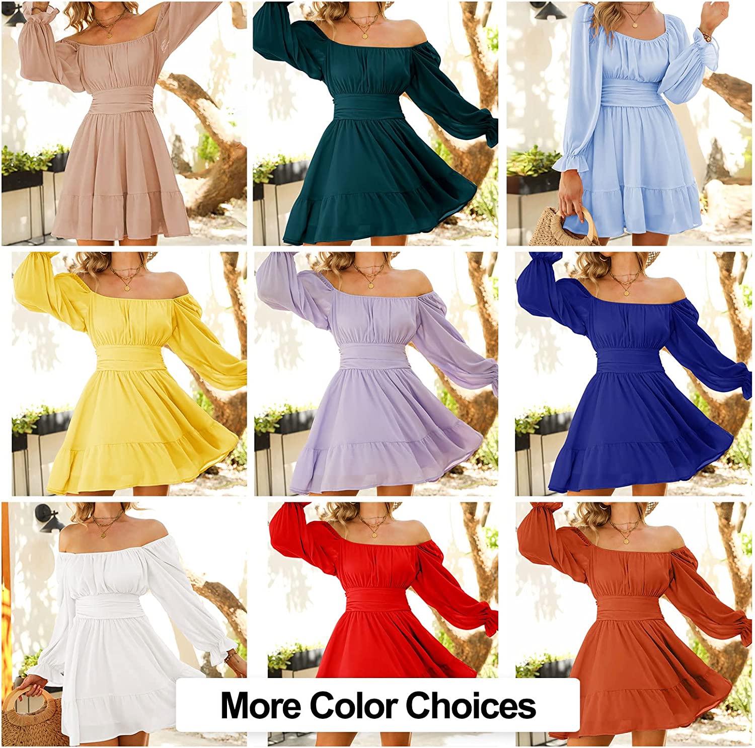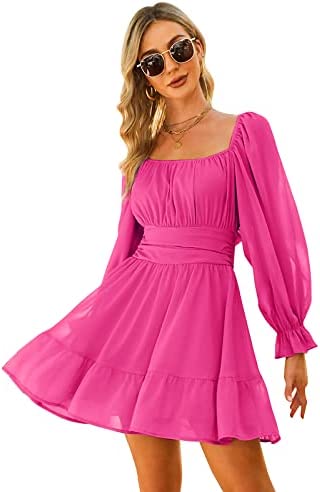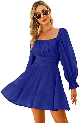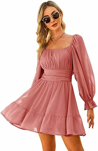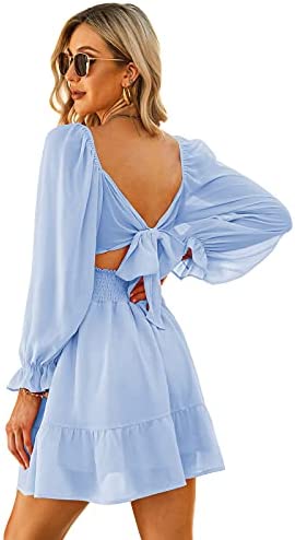 EXLURA Women Tie Back Wedding Guest Dresses Long Lantern Sleeve Square Neck Ruffle Elastic Waist Aline Casual Mini Dress