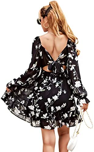 • Feature: tie back, open back, square collar, ruched bust, smocked waist, elastic high waist, lantern sleeve, long sleeve, elastic cuff, above knee length, A line, slim fit, swing and elegant vintage chiffon dress.