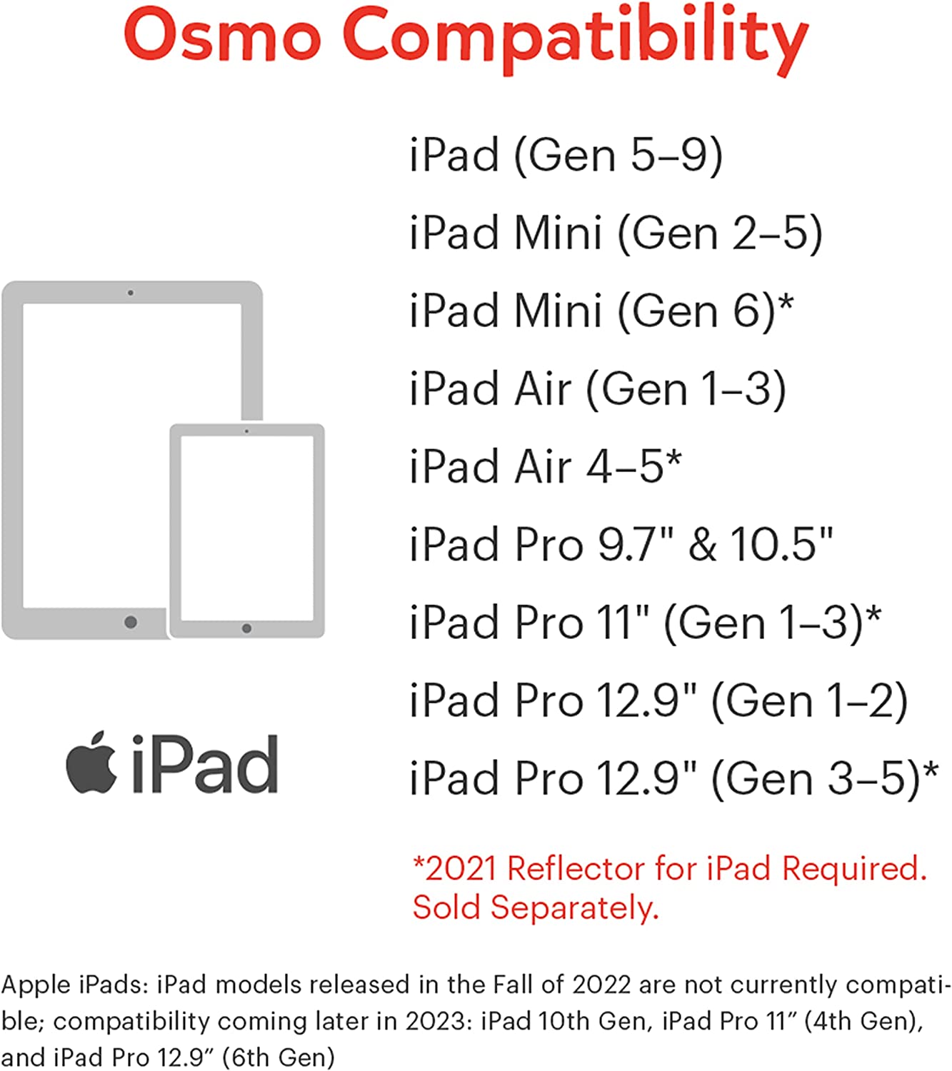 - COMPATIBILITY FOR IPAD: All iPads except Generation 1-4. The new iPad 10th Gen, iPad Pro 11” (4th Gen), & iPad Pro 12.9” (6th Gen) are not currently compatible; compatibility coming later in 2023. iPad Reflector 2021 required for: iPad Mini 6, iPad Air 4-5, iPad Pro 11-inch & iPad Pro 12.9-inch. The minimum iOS version needed is iOS 11.