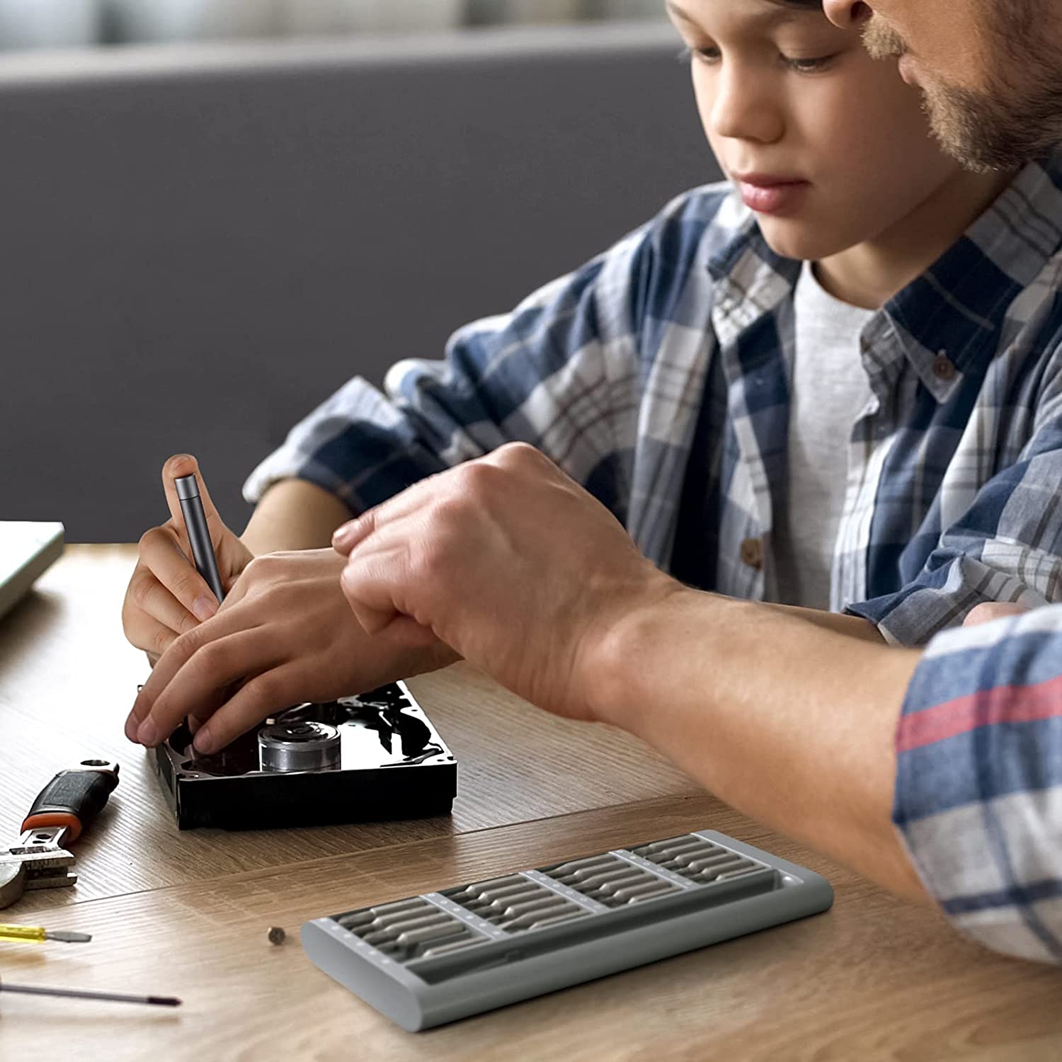 - Magnetic Storage Box: Built-in ejection button, one-click pop-up bits container, more convenient for you to take out and lock the bits container. Magnetic box helps hold all the screws in place so that they do not fall off. Now you never have to worry about losing the bits. The head of the screwdriver shaft has also a built-in strong magnet, which makes it easy to install the bit, the magnetic screwdriver bits can also easily suck up small screws.