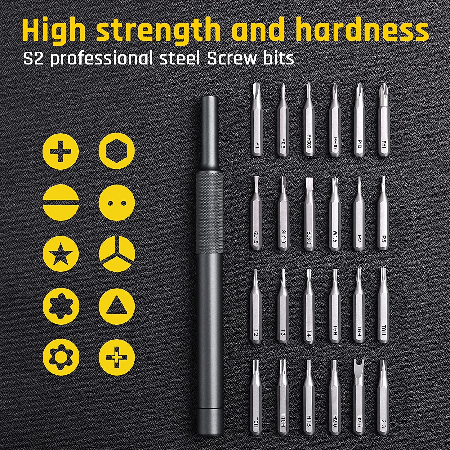 | Included Components | 24*S2 steel magnetic precision bit heads: PH1, 0, 000, 00; SL2, 1.5; T8H; T10H; T5H; T6H; T9H; H2, 0.7, 0.9, 1.5; T2, 3, 4; P2, 5; W1.5; Y0.6, 1; 2.3 |