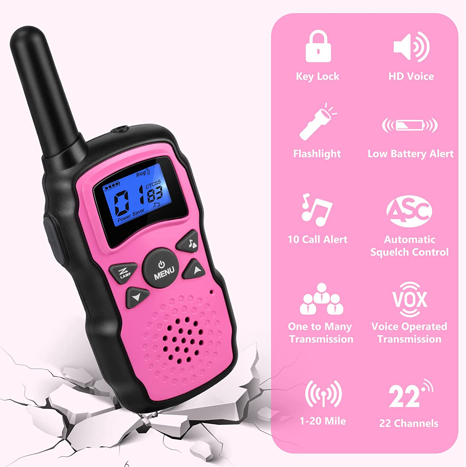 ?【Long Range Radio Walkie Talkies】:The upgraded chipset greatly improved reception sensitivity and enhanced signal stability. Up to 1 mile in neighborhood, up to 20 miles in Mountain to Valley. You and your kids can enjoy a clear and fluent communication around the house and garden. The range in real conditions can be reduced from the maximum range