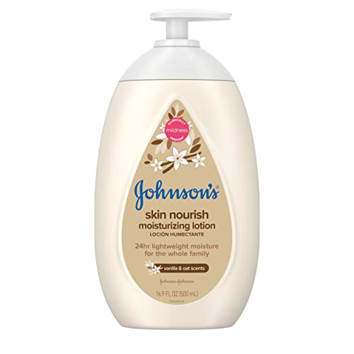 About this item            16.9-fluid ounces of Johnson's Skin Nourish Moisturizing Baby Body Lotion with vanilla and oat scents and moisturizers to soothe and relieve dry skin for all-day-long moisture   This daily lotion moisturizes for 24 hours and offers a non-greasy feel, with 96% agreeing it leaves skin feeling soft and smooth  Enriched with moisturizers and a gentle vanilla and oat scents, this skin nourishing lotion is suitable for babies, kids and adults too  With clinically proven mildness, the hypoallergenic lotion is tested with pediatricians and dermatologists and contains no parabens, phthalates or dyes  This baby lotion for dry skin is a great addition to a regular skincare routine. After a warm bath or shower with Johnson's Skin Nourish Wash, gently massage lotion over entire body to leave skin feeling soft and smooth