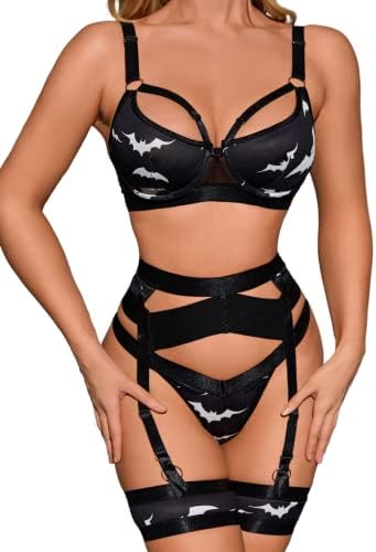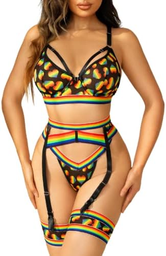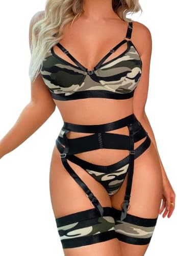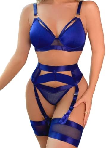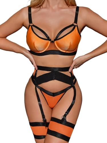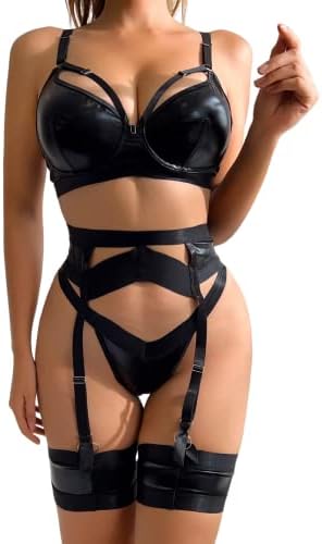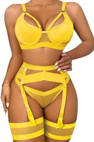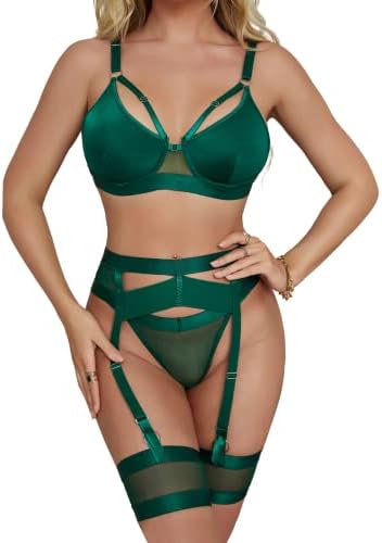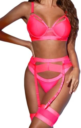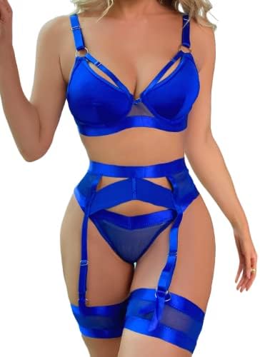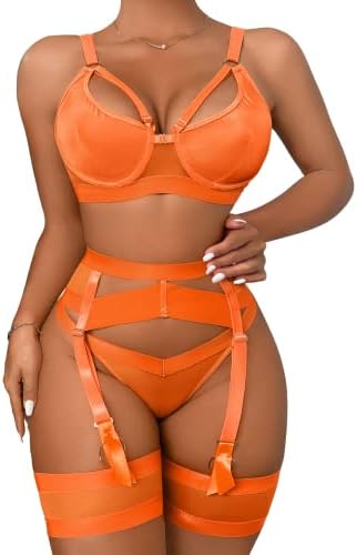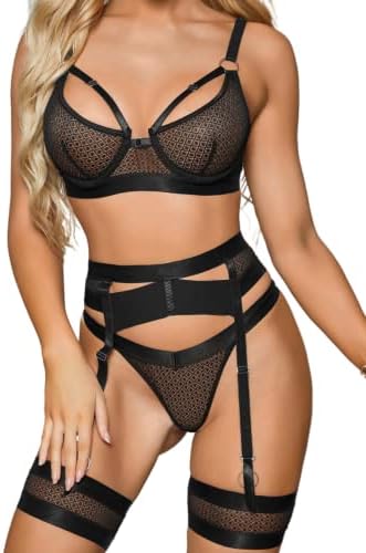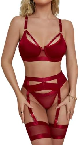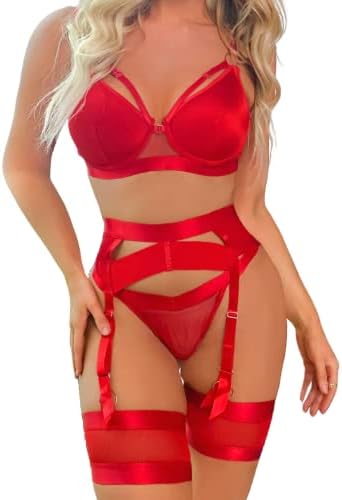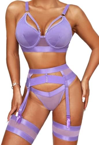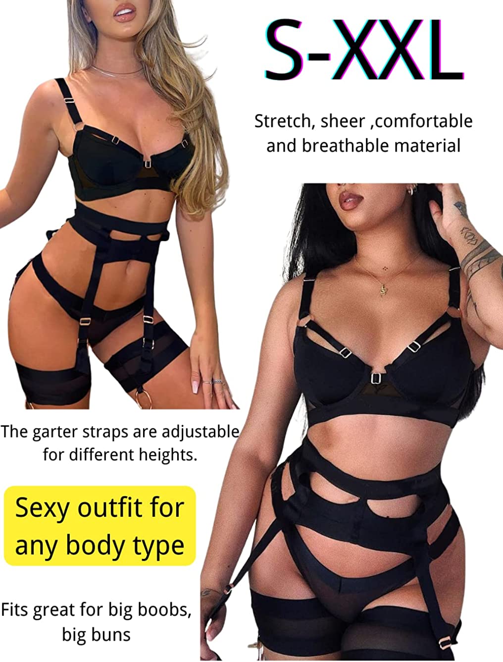 ✿Feature: This matching bra and panty set with belt and thigh bands is featured with strappy, high leg, metal ring, sheer mesh which shows your curve beautifully.