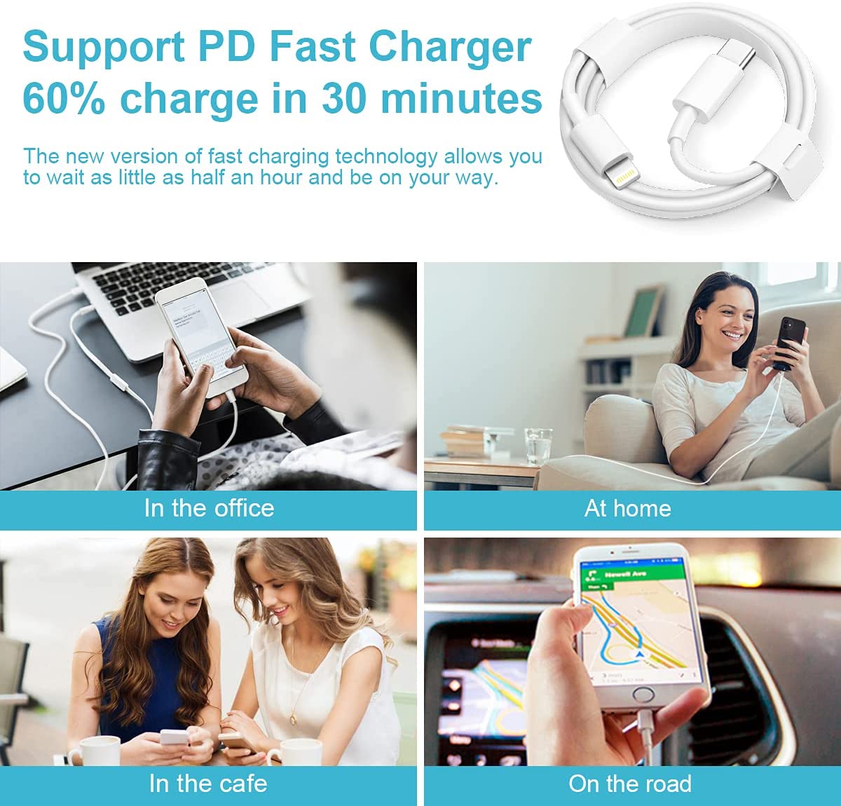 • [Safety Efficient Fast Charging] The Power Delivery Wall Charger for iPhone owns bulit-in multi-protection system, avoiding from over-voltage, over-charge, over-heat, etc. The smart chip including in the MFi certified fast cable match the current required by the Apple device automatically, charge your iPhone/iPad device fast, safely and steadily.Tangle-free 6 Feet length is convenient for usage while charging and sync at home/office/travel in bed, hotel rooms, and more.