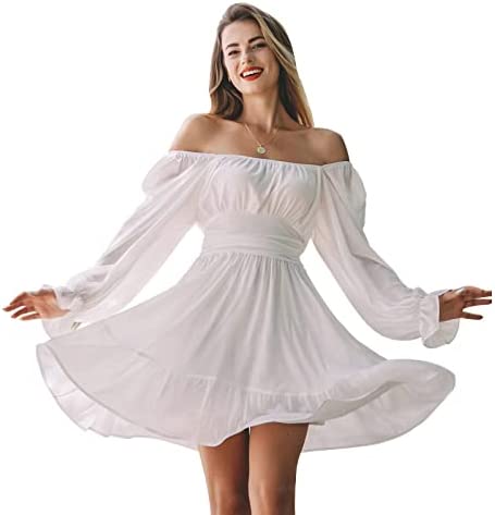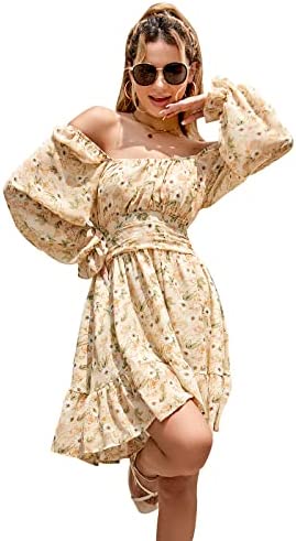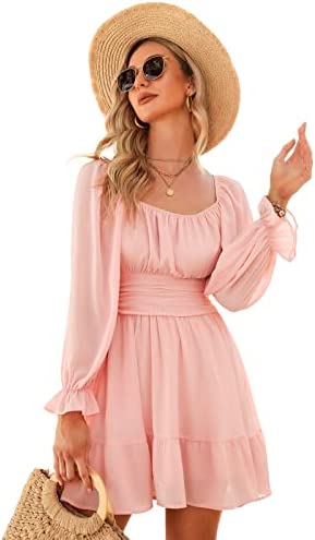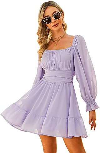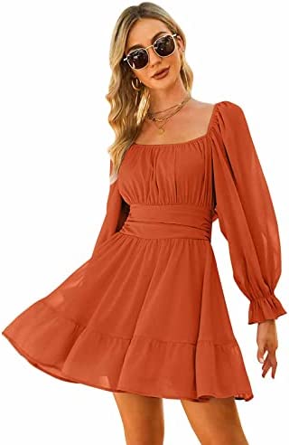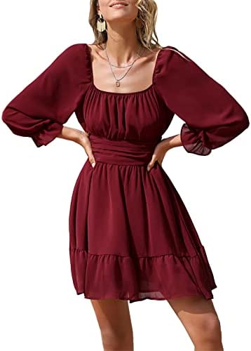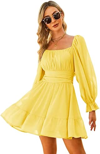 EXLURA Women Tie Back Wedding Guest Dresses Long Lantern Sleeve Square Neck Ruffle Elastic Waist Aline Casual Mini Dress