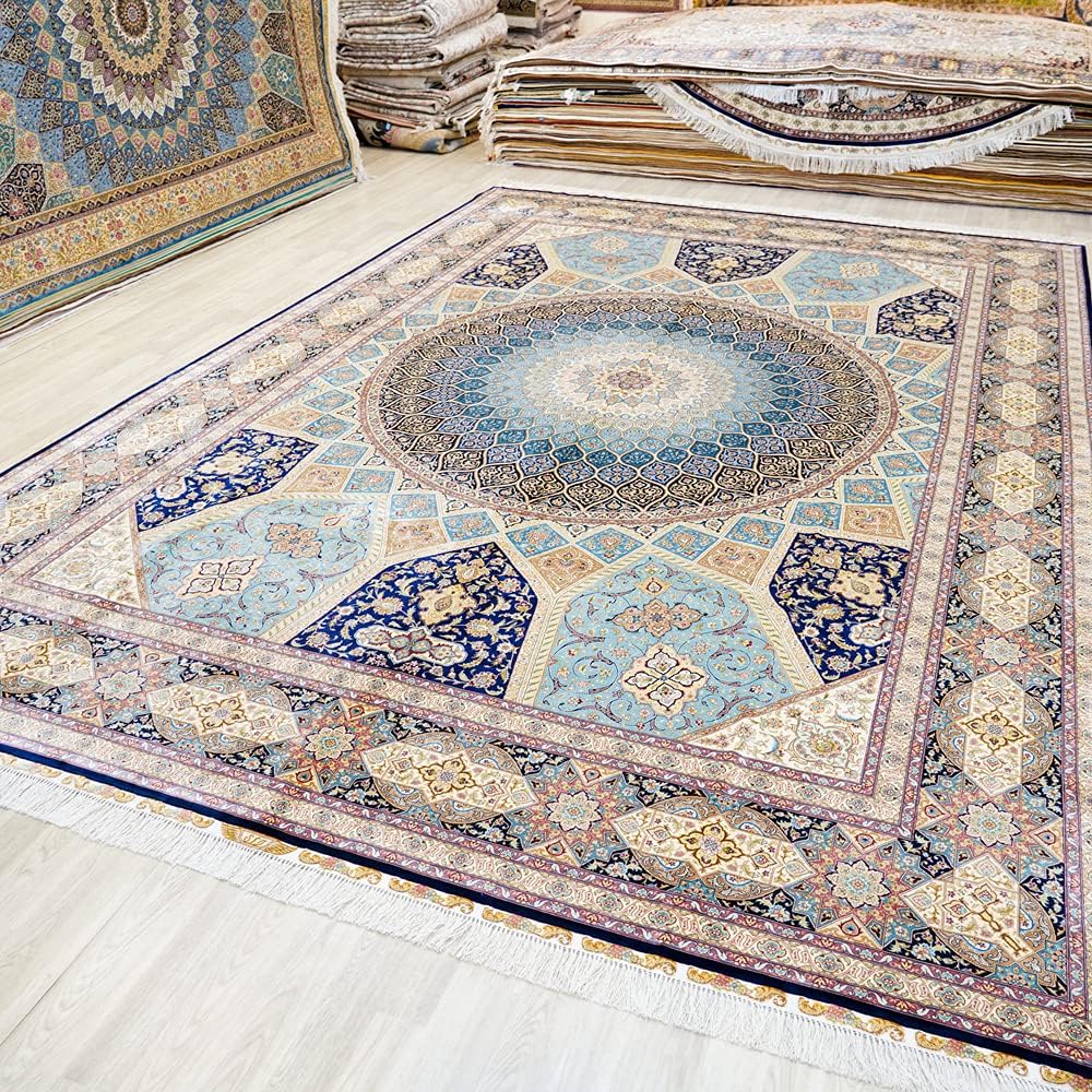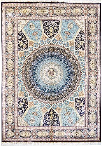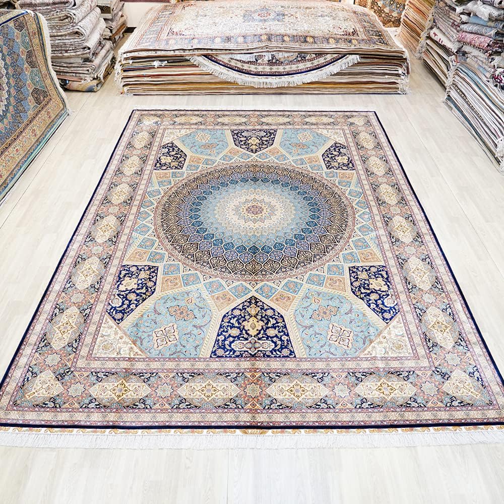 Yilong Silk Rugs Pure Handmade Carpet Large Dome Design Persian Rug Home Decor (10x14ft, Blue&Beige 11)