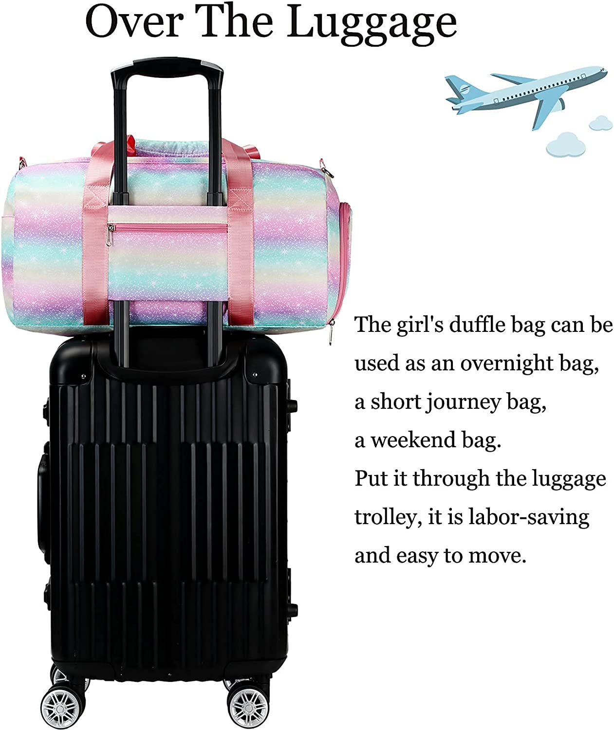 • 【MULTIPURPOSE KIDS OVERNIGHT BAG】The kids overnight bag can be used both indoor and outdoor. Girls duffel bag with handles, and removable shoulder strap with adjustable buckle.Your good companion for sports, could be served as a gymnastics bag, sports gym bag, dance bag, cheerleading bag, camp / airplane duffel, carry-on luggage.