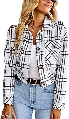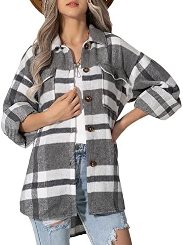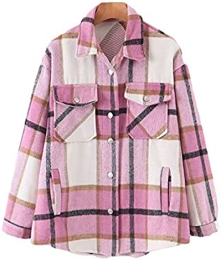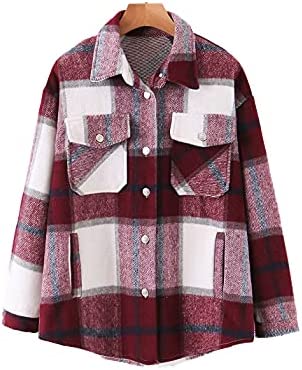 • Feature: fall winter wool blend plaid shirt jacket, casual winter jacket for women, lapel collar turn-down collar long sleeve oversized flannel shackets jacket with front button placket, color block contrast plaid print button down shirts for women lady girls