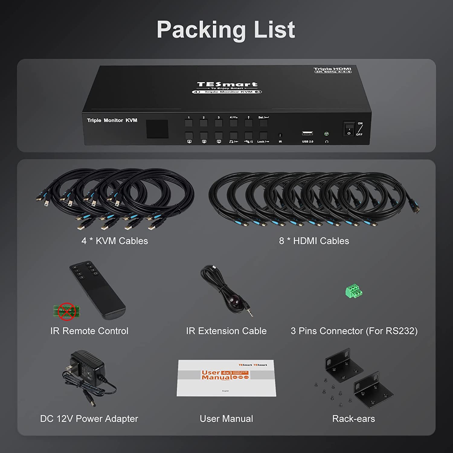 TESmart KVM Switch 3 Monitors 4 Computers 4K@60Hz 4:4:4, Support 3 USB Peripherals, 2 Audio Out, Mechanical, Multimedia Keyboards, RS232, Triple Monitor HDMI KVM Switches 4 Port Box with KVM Cables