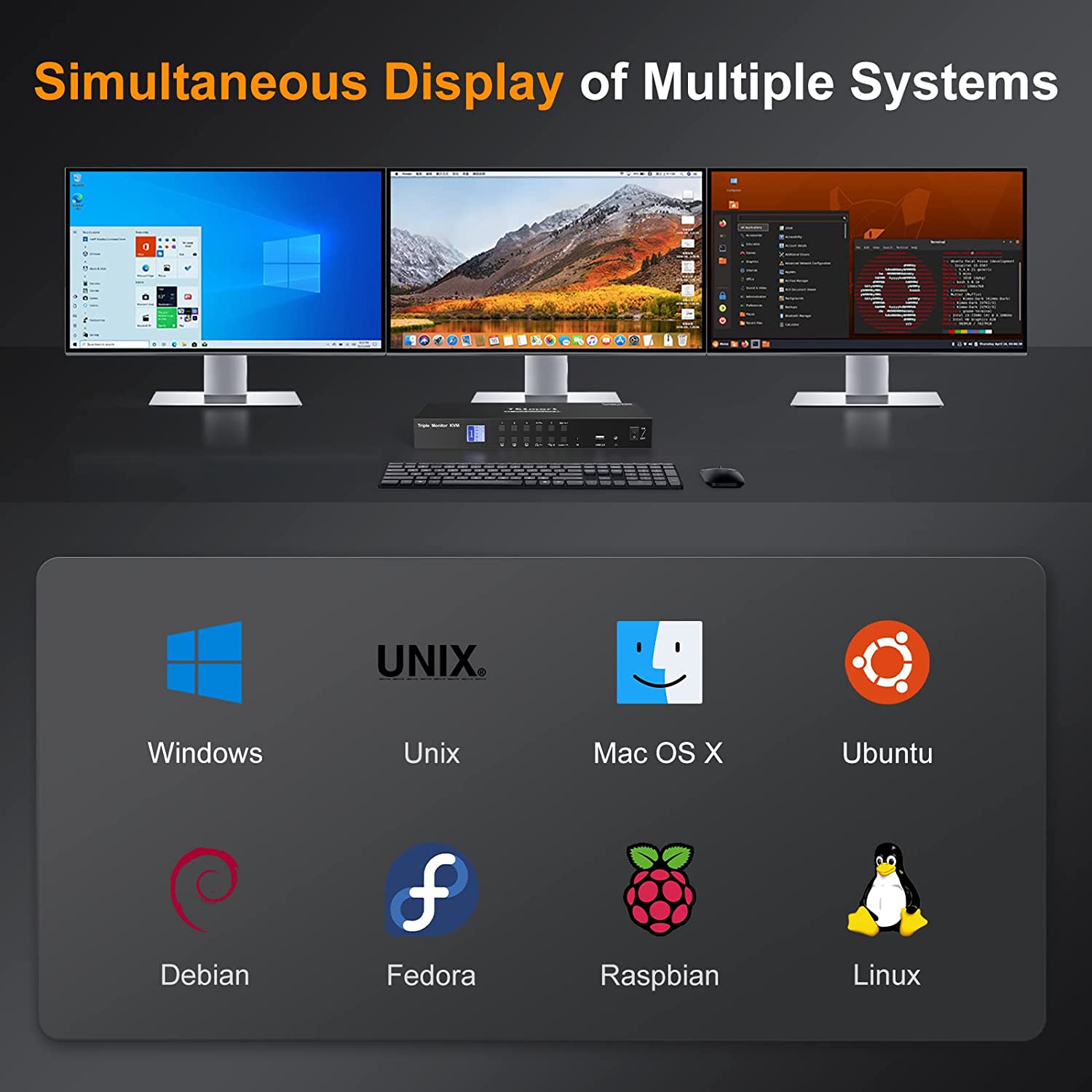 • 【SUPPORTS SIMULTANEOUS DISPLAY OF MULTI SYSTEMS】TESmart 3 monitor KVM cross supports multiple operation systems, compatible with Unix/Windows/MacOS X/Ubuntu/Debian/Fedora/Raspbian/Ubuntu for Raspberry Pi and other Linux based systems. Plug and play without any software needed. This unit is the best KVM switch choice for IT professionals who tend to work with multiple systems at any given time.