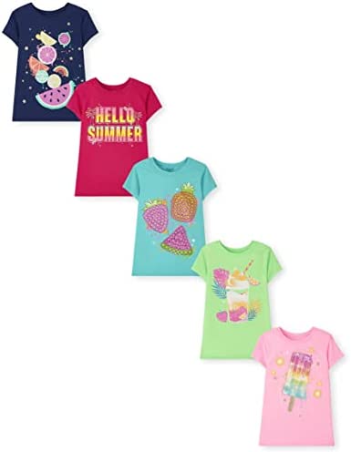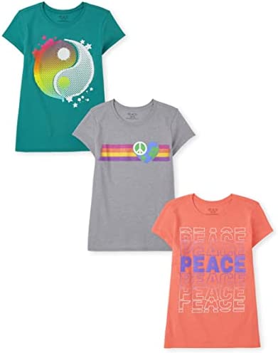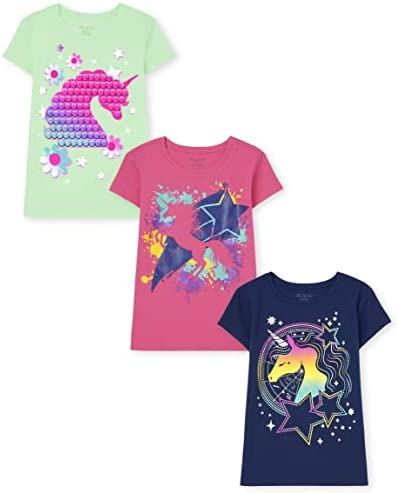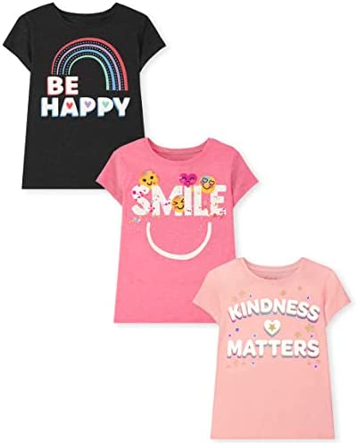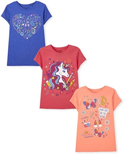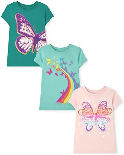 - MULTIPACK — 3-pack of graphic t-shirts: 1 style with butterfly graphic design at front; 1 style with butterfly and hearts graphic design at front; 1 style with rainbow and butterflies graphic design at front