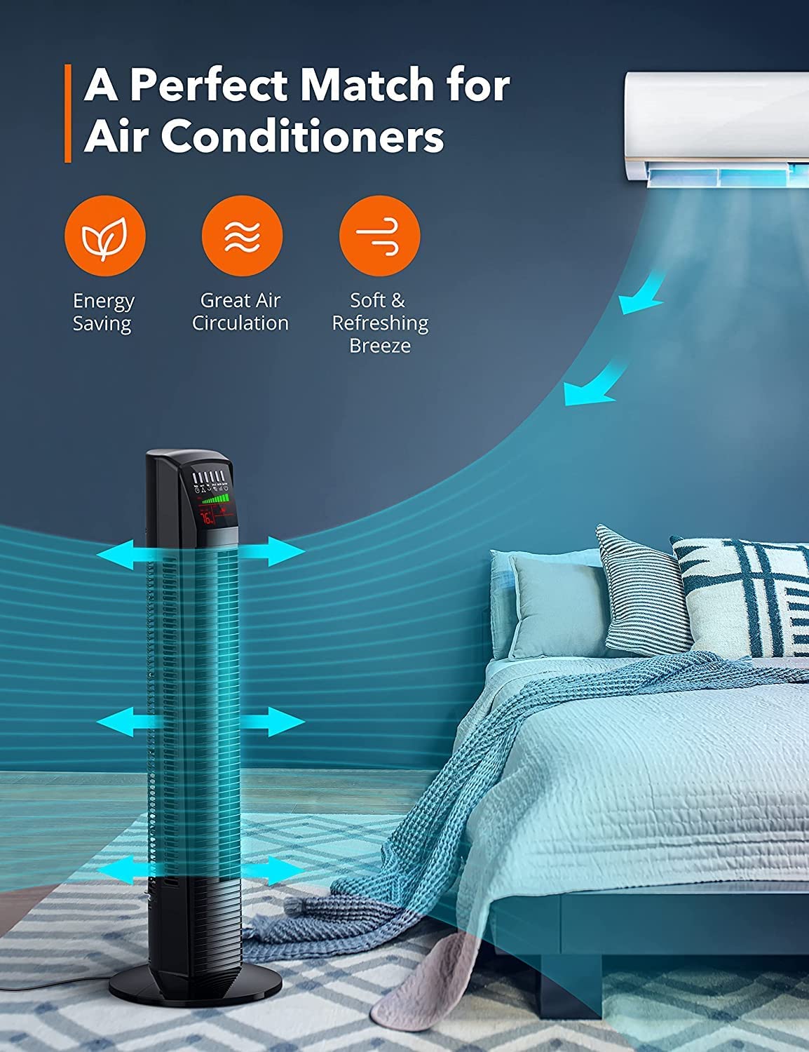 - Larger Airflow Coverage & Space Efficiency: While small fans don't take up too much space, they offer lower airflow that can't reach you in a high bed or a spacious kitchen. Our large tower fan strikes a great balance between high blow efficiency and space arrangement. Thanks to its 35" size and strong airflow, it can keep you cool anywhere, while its slim design allows you to place it anywhere, regardless of your room size.