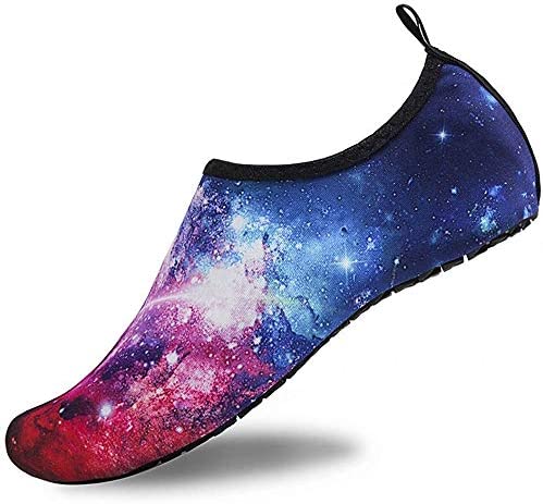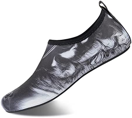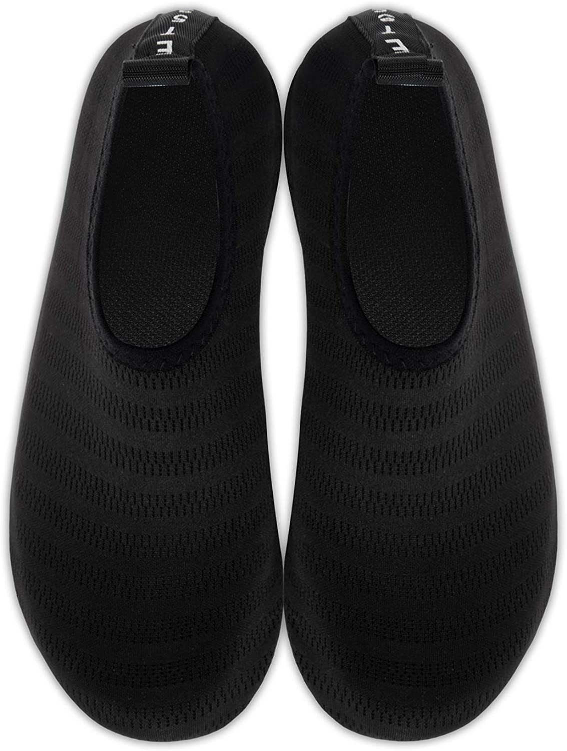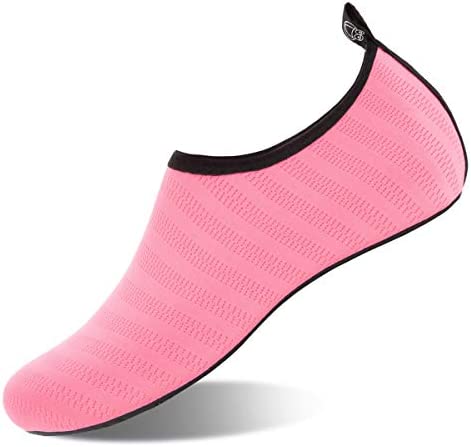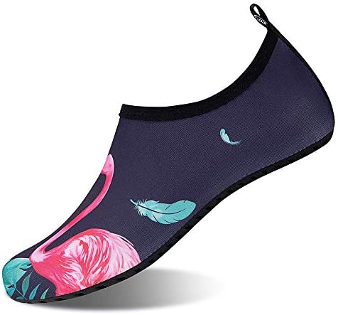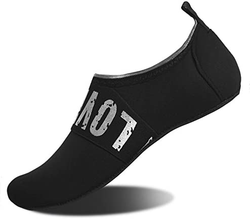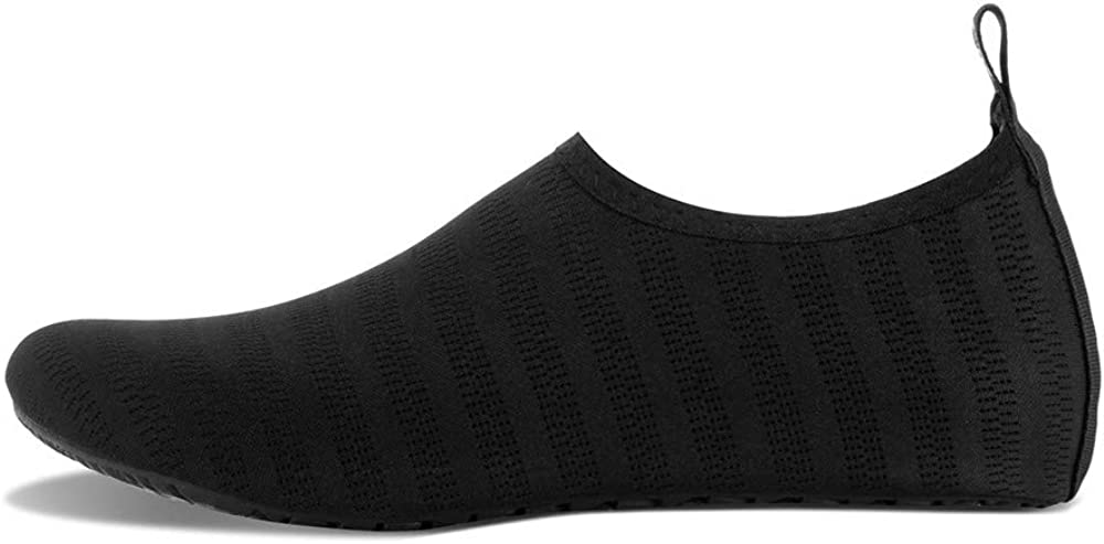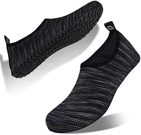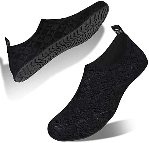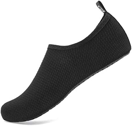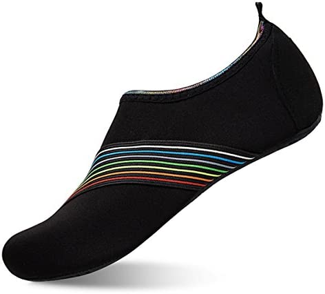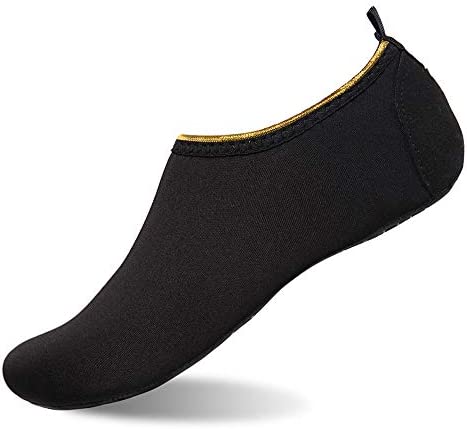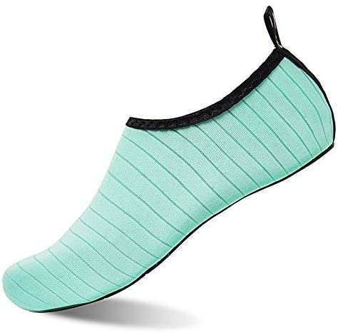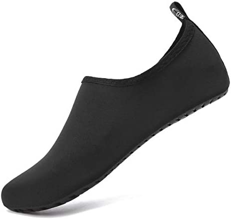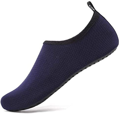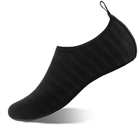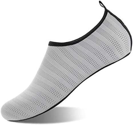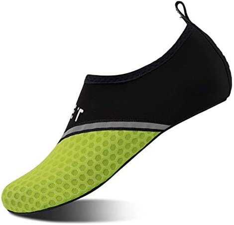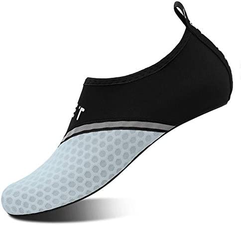 PERFECT MATERIAL: 92% polyester+8% spandex Upper. Breathable Ultra Light fabrics with fine stretch on uppers, flexible and comfortable. Smooth designed neck prevents chafing when wearing our water shoes. FOOT SAFETY -- Wearable and top-quality rubber sole, which protects your feet from being hurt by sharp objects. With an ergonomically molded, shock absorption performance cushioning separated protective toe.