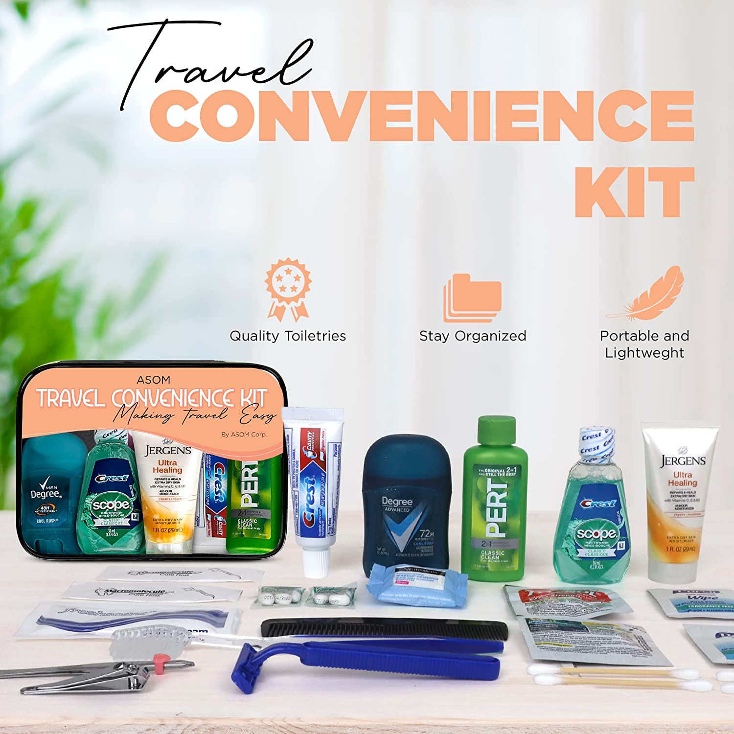 Asom Toiletry Travel Convenience Kit, Premium Personal Care Hygiene Essentials Bathroom Toiletries Accessory Set, Tsa Approved Clear Toiletry Traveling Size Bag Guest Accessories Kits, 20 Piece.