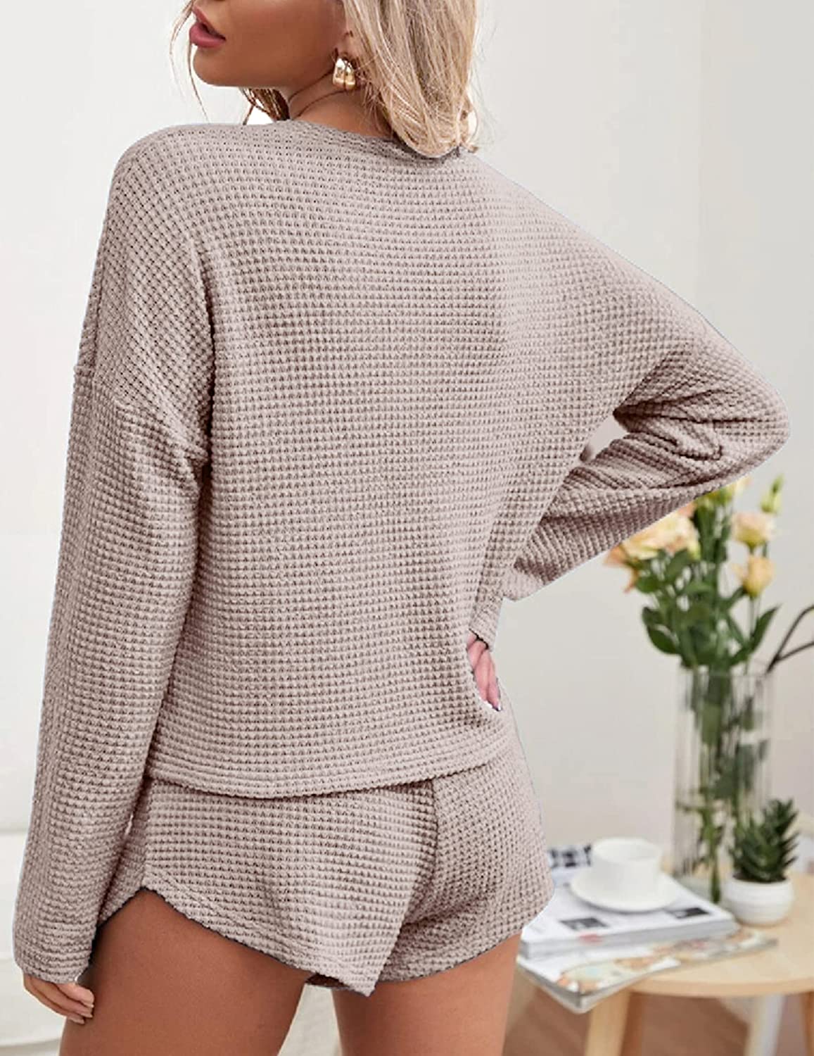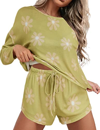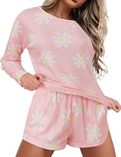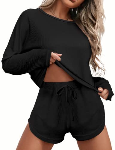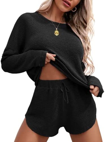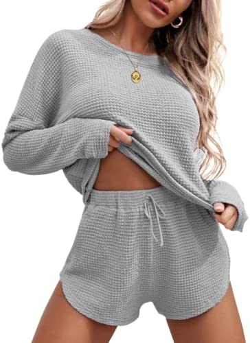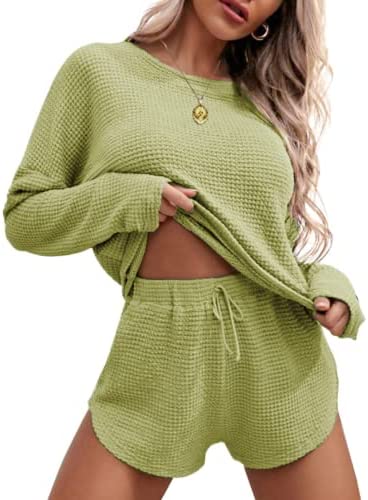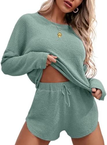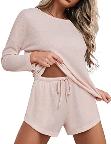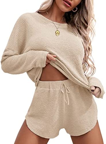 Ekouaer Womens Waffle Knit Pajama Sets Long Sleeve Top and Shorts Matching Lounge Set Loungewear Sweatsuit with Pockets