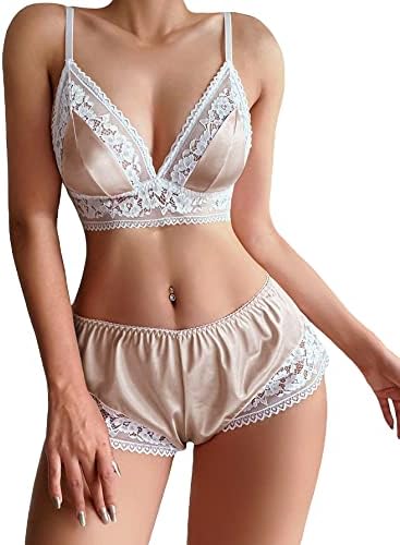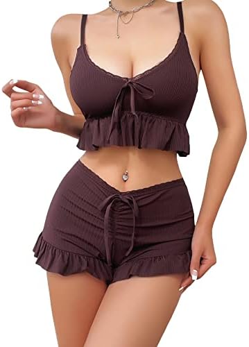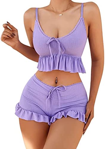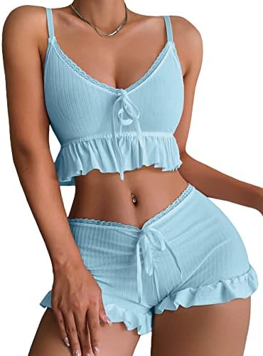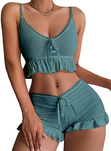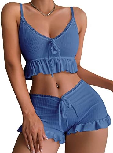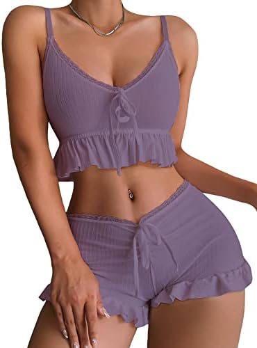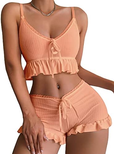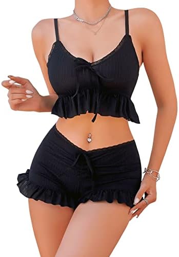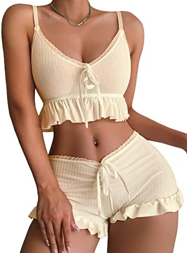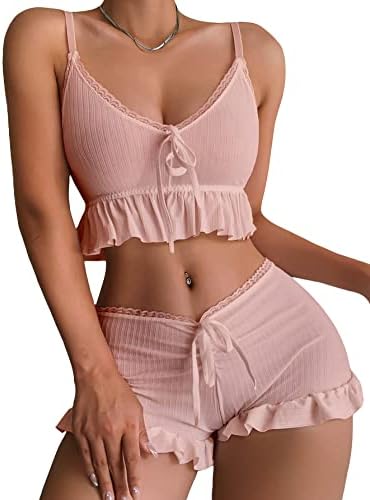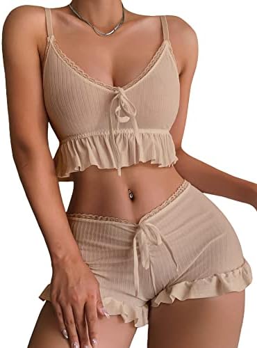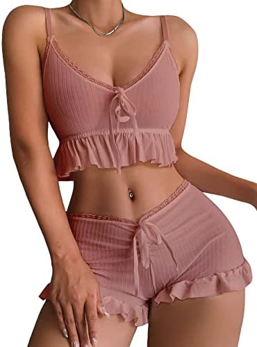SweatyRocks Women's 2 Piece Lingerie Set Ruffle Trim Tie Front Cami Top and Shorts Sleepwear