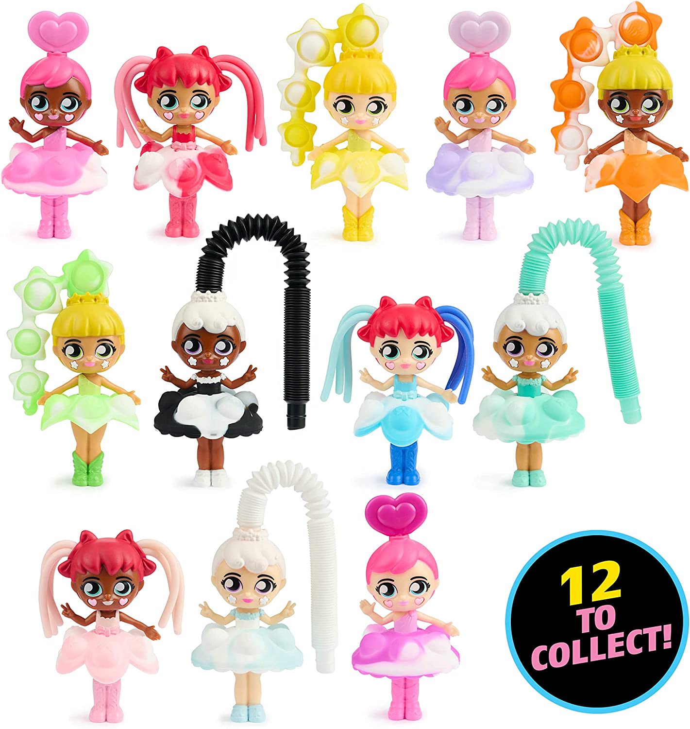 COLLECT ALL 18. Unbox to reveal 1 of 18 surprise Fashion Fidgets dolls. Will your fidget doll’s outfit pop, twist, pull or spin?. Can you collect ‘em all?