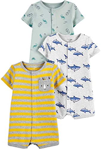 Featuring sweet prints and pocket details, this 3-pack of rompers will get them out the door in a snap!
