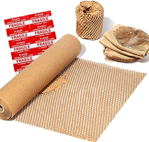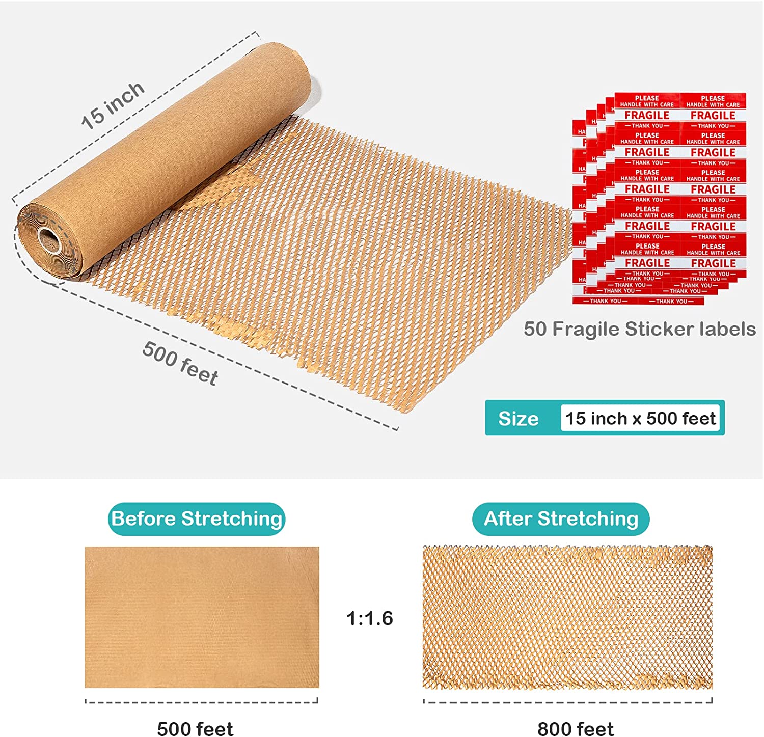 Honeycomb Packing Paper Size: 15 inch x 135 feet. Comes with 20 fragile sticker labels. Made of 54 lbs recyclable kraft paper. How it works: Strenthed honeycomb structure can get a protective padding, makes a better cushioning performance. Protect your items from breaking, such as dishes, glasses, crafts, frame, pictures, china, plates and cups, etc. Great for moving, shipping or wrapping breakables and delicate Items.
