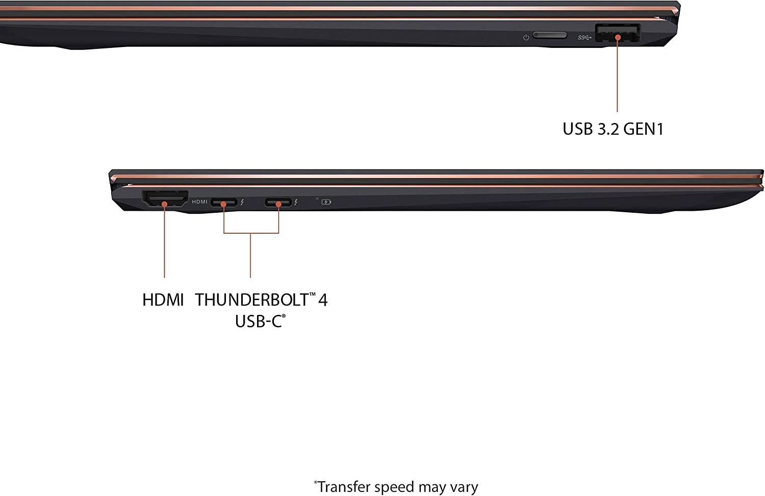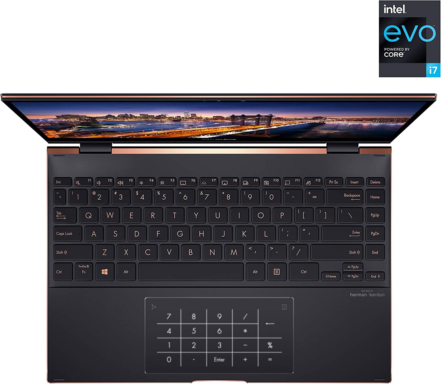 ZenBook Flip S is supremely elegant, with Red Copper diamond-cut highlights that perfectly complement its timeless Jade Black finish. A mirror-polished deco bar adds a subtle finishing touch, creating a luxurious overall look that stands out from the crowd without being extravagant.