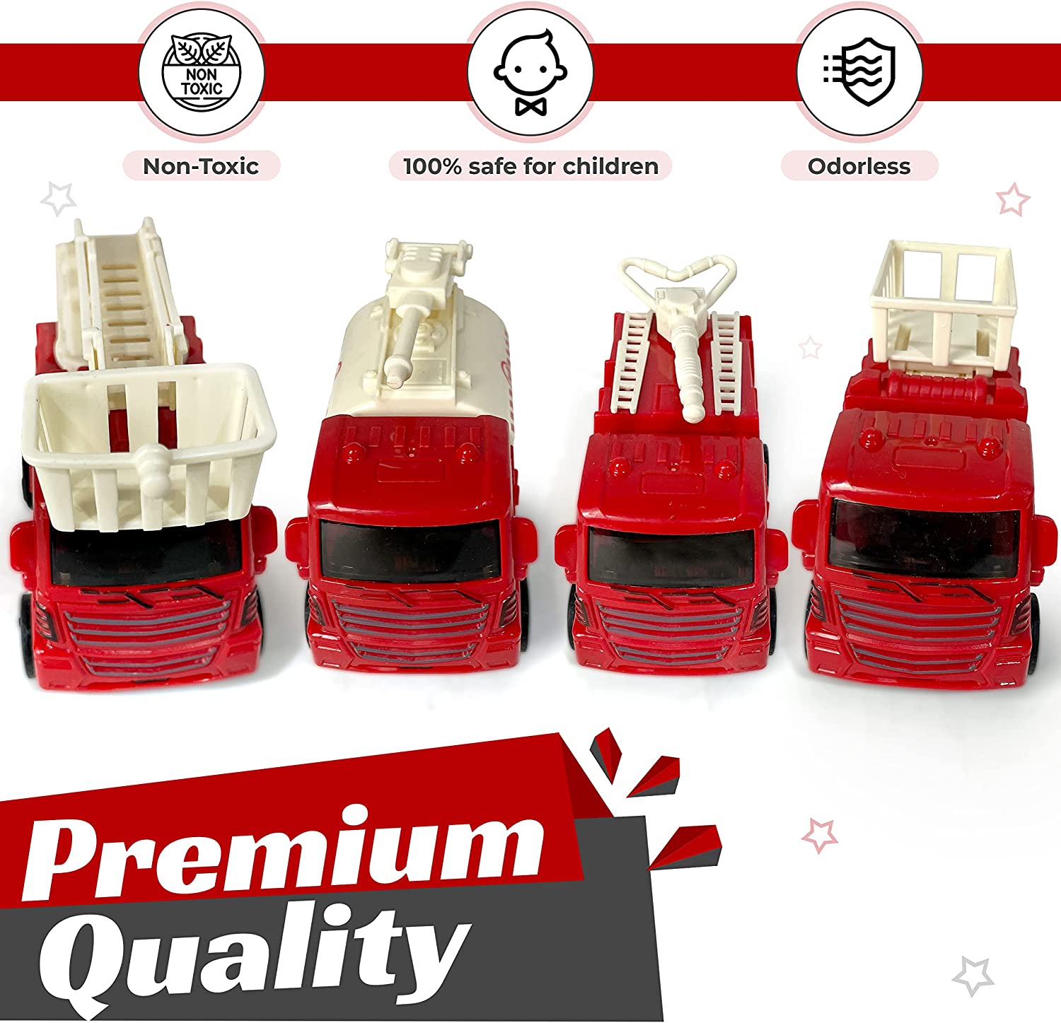 • Durable Design: This fireman toddler trucks toy set made of ABS. Sturdy and long-lasting, this material is a good option for kids ages three and up. The trucks are 100% non-toxic and odorless, which creates a secure playing environment for the little ones.