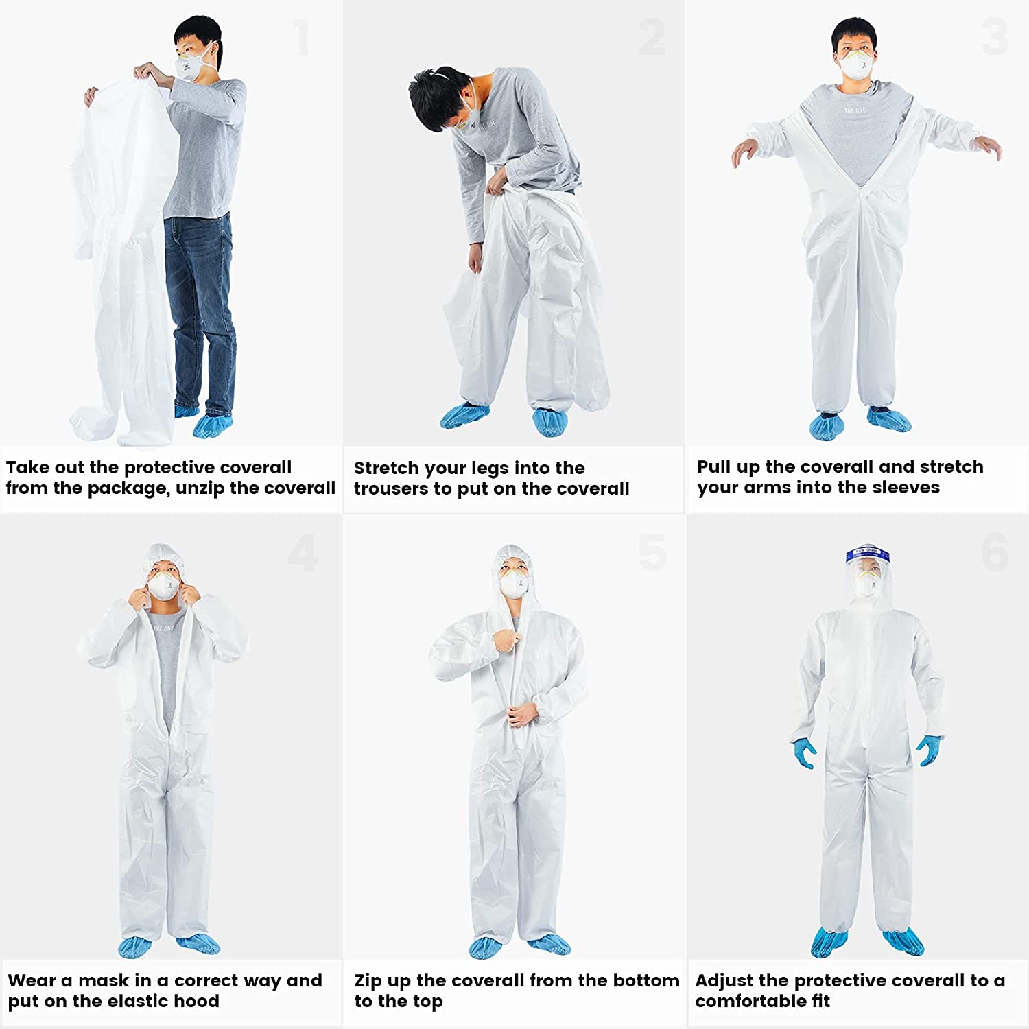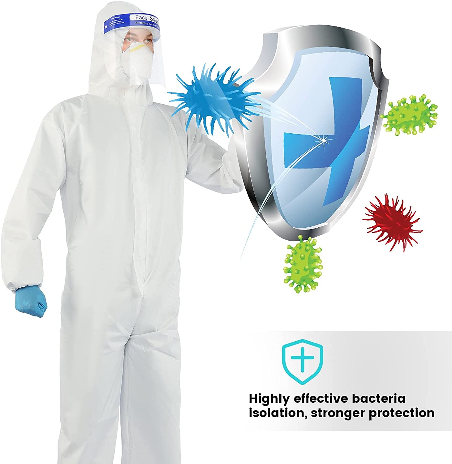 • 【Heavy-Duty Isolation Coverall with 360 Degree Protection】This one-piece white PPE coverall suit features an elastic hood, wrists, and ankles for a snug fit and reliable protection from liquid and particulate. The front zipper allows for easy on and off and the coverall provides full body coverage, shielding skin and clothing from dirt, dust, light liquid splashes, paint, and most mild chemicals and biological agents.