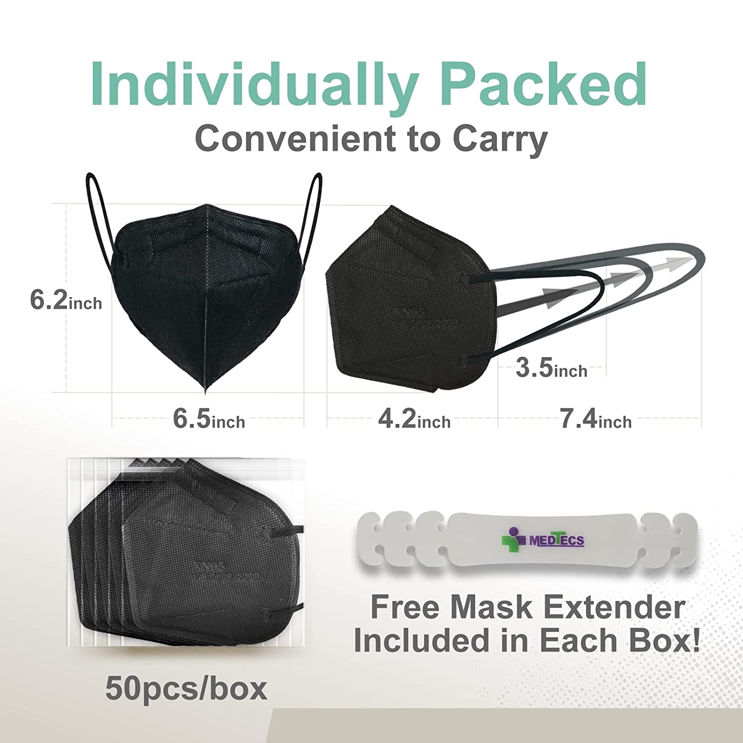 Medtecs KN95 Face Masks Disposable - Individually Wrapped, 5 Ply Protection & Extra Wide Elastic Ear Loops Design, ≧ 95% Filtration Efficiency | Mask Extender included, 50 PC - Black