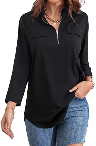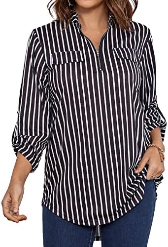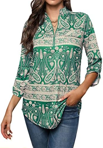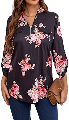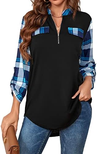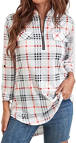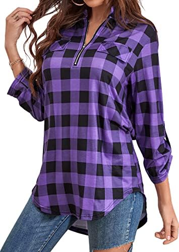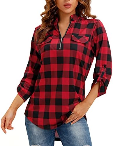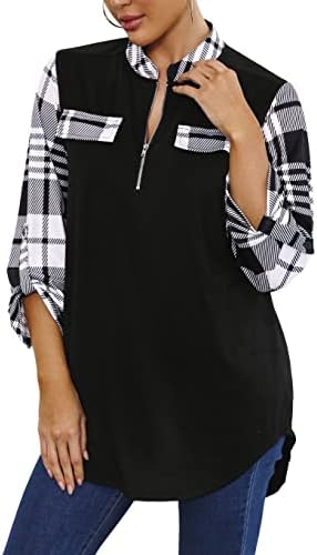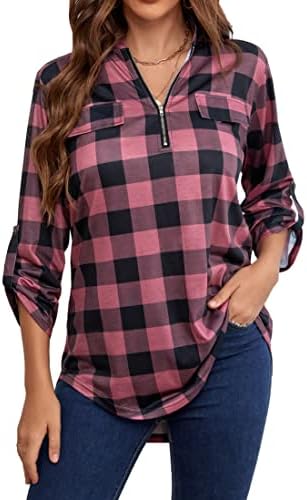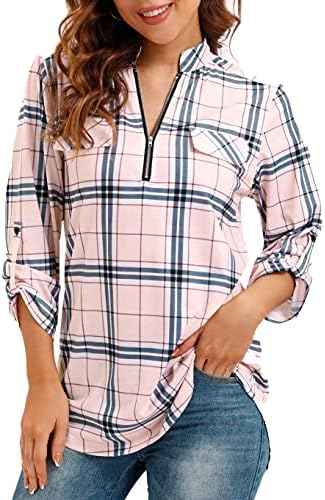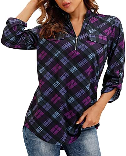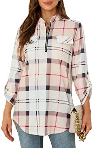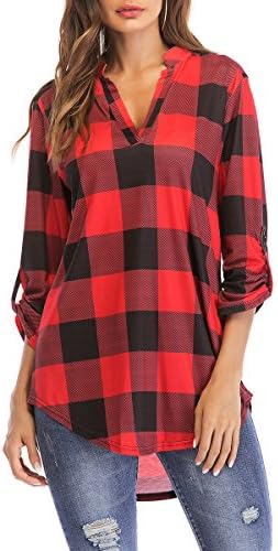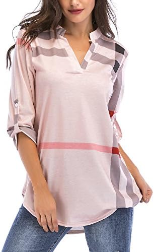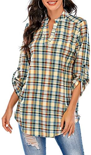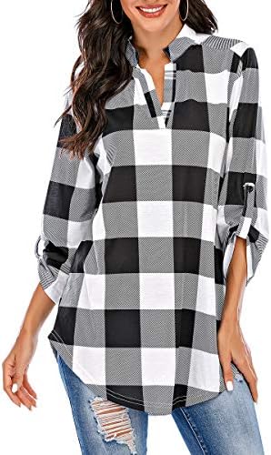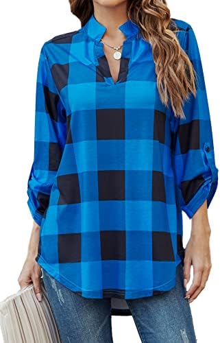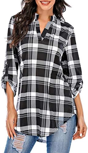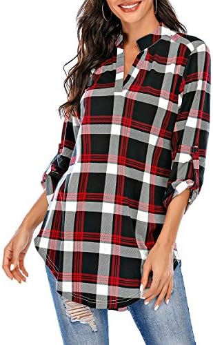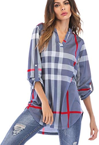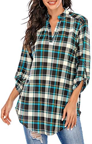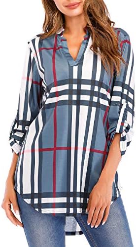 St. Jubileens Women Roll-Up 3/4 Sleeve Plaid Shirt Tunic V Neck Casual Pullover Blouses Tops