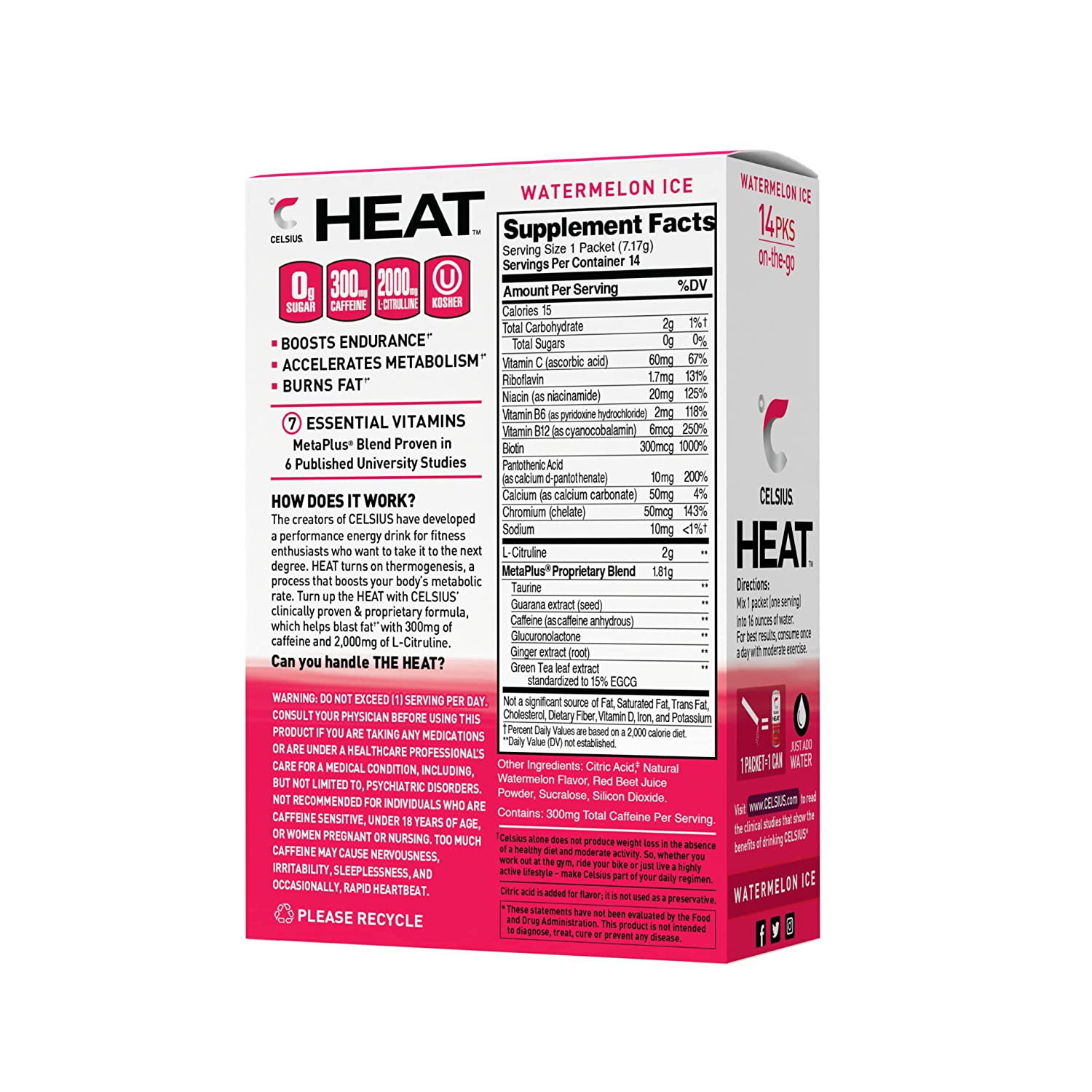 CELSIUS HEAT On-the-Go Performance Energy Powder Stick Packets, Watermelon Ice (Pack of 14)