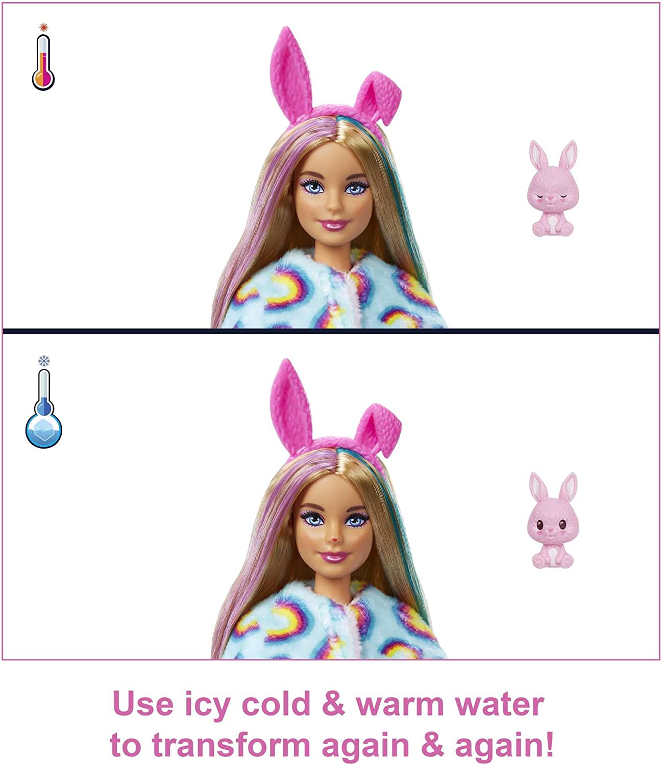 • Kids can dress and accessorize Barbie doll by reversing the costume top to find a super-soft fleece jacket with a mini-rainbow print. The costume head turns into a bed for the bunny friend, too..Surprises continue for color-change cuteness -- use ice cold water to transform Barbie doll’s face with animal face paint and to “open and close” the bunny’s eyes. Change back with warm water. Repeat again and again!.