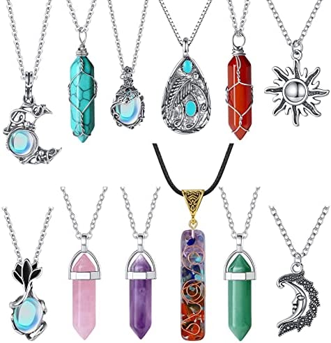 The 10-piece healing crystal necklace 7 chakra necklace, evil eye necklace, vintage sun moon necklace, amethyst necklace, rose quartz necklace, rose quartz heart necklace, carnelian necklace, obsidian green aventurine necklace. A variety of vintage style hippie boho fashion necklaces that are very beautiful you can match with different styles of clothing.