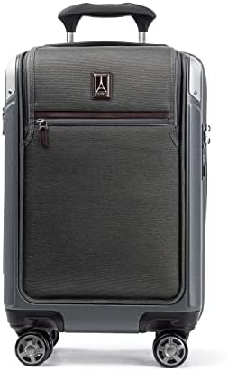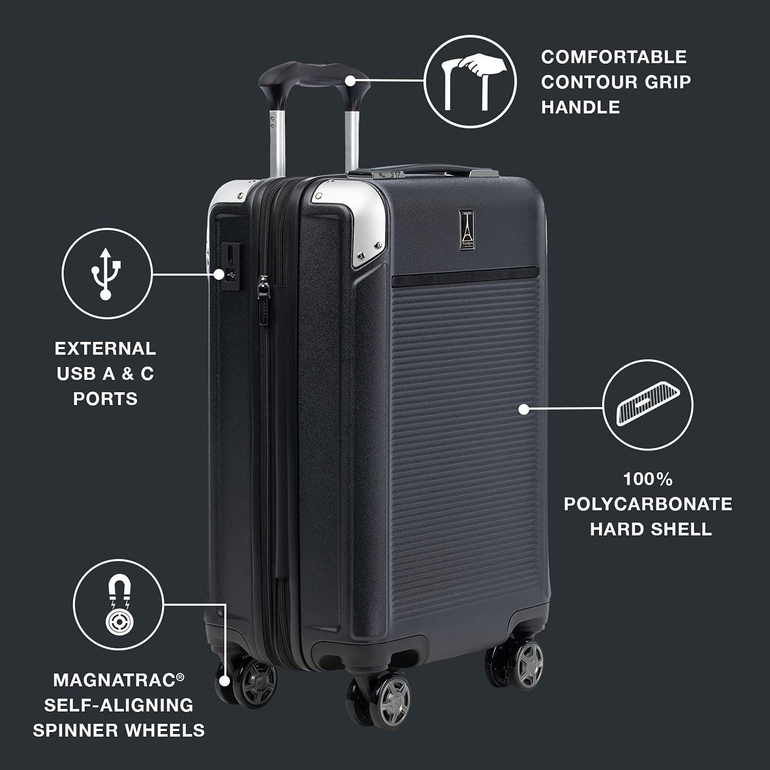 Stylish, ultra-durable and loaded with features, the Platinum® Elite Expandable hard shell carry on luggage offers all the modern conveniences you want in a sophisticated carry-on that adapts when you need more packing space. This travel suitcase lets you power your electronics on the go using external USB A & C ports with fast-charge capabilities and a dedicated external-access battery pocket (patent pending) that provides FAA-compliant storage for your power bank. Carry on luggage with spinner wheels is sizer bin tested to fit in the overhead bins of most major domestic airlines, this carry-on also offers a zippered 2” expansion option to increase packing capacity when needed. Designed for great looks and ultimate resilience, this hardside luggage is durably constructed with an ultra-strong, easy-to-clean, 100% polycarbonate shell that flexes upon impact to prevent cracking and keep contents protected, while its attractive textured finish helps reduce the visibility of scuffs or scratching. Genuine leather trim adds sophistication, and distinctive aluminum corner armor protects high-impact areas in style. The built-in TSA-approved lock allows authorities secure access for inspection when required. Pack with ease inside the clamshell design with two zippered divider panels that keep contents separated and stored securely in place. This hardside carry on luggage has multiple accessory pockets that provide built-in organization, and a convenient, water-resistant pocket stows damp items or toiletries. On the move, this compact beauty flies with precise control and effortless roll, thanks to the Travelpro® exclusive PrecisionGlide™ System–eight MagnaTrac® self-aligning spinner wheels led by a sturdy, four-stop adjustable PowerScope Lite handle with comfortable Contour Grip. Hard sided luggage with spinner wheels is backed by our Built For a Lifetime Limited Warranty with the Trusted Companion Promise that even covers damage caused by airlines or other common carriers for the first five years of the lifetime warranty.