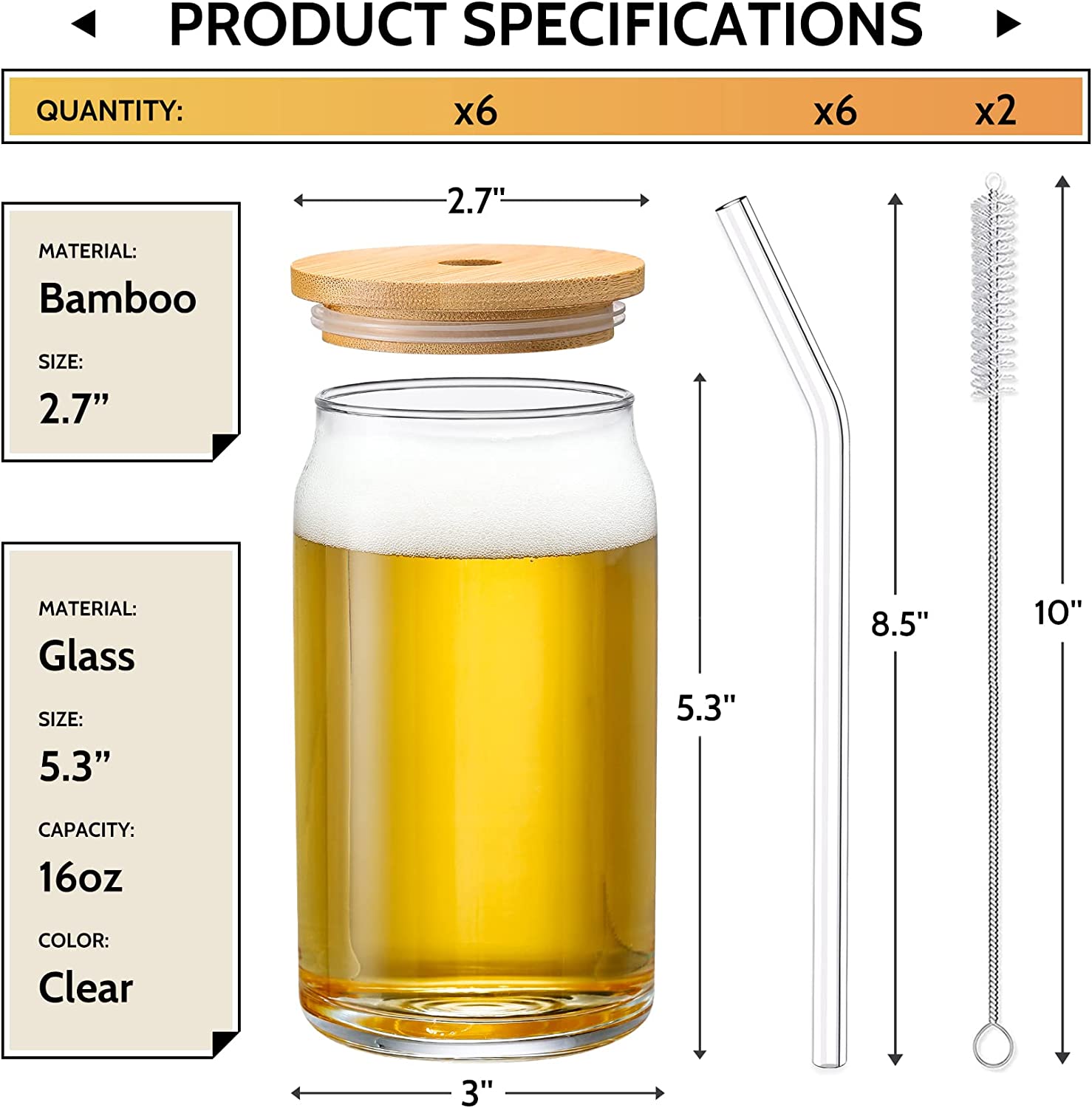 • CLASSIC BEER GLASS SET: 6 beer glass with 6 glass straws, 6 bamboo lids and 2 straw brushes in the package. Each glass measures 5.3” in height and 3 with width, holding liquid of 16oz. The length of straw is 8.5” meaning you still have proper length left even insert in the glass fully. Classic figures make this glassware a unique one-size-fits-most option for a variety of beverages.