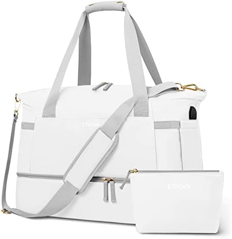 Gym Bag for Women, Sports Travel Duffel Bag with USB Charging Port, Weekender Overnight Bag with Wet Pocket and Shoes Compartment for Women Girls Travel, Gym, Yoga, School (Off White)