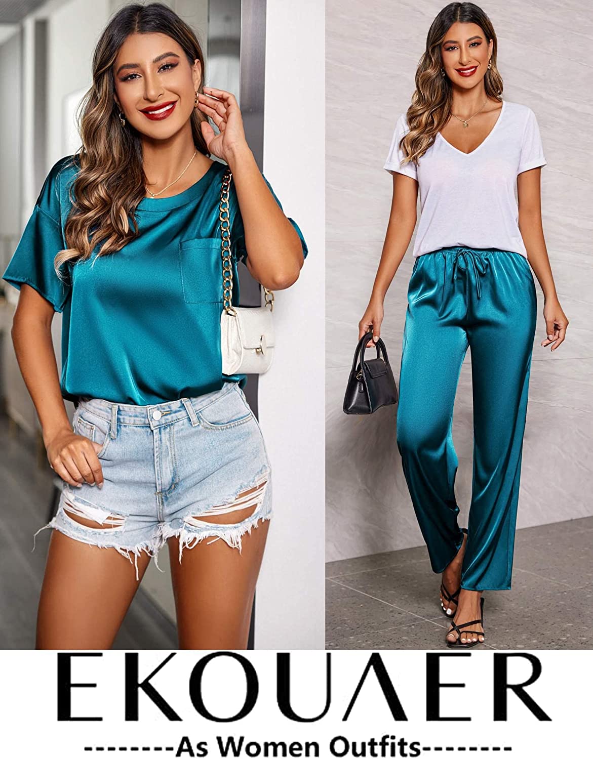 Top: Loose fit, satin short sleeve t-shirt. Solid color, crewneck, and a chest pocket casual nightwear.