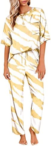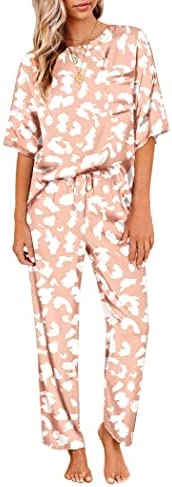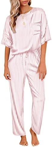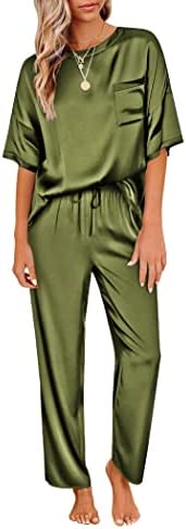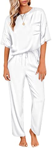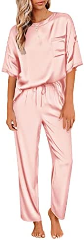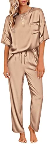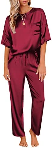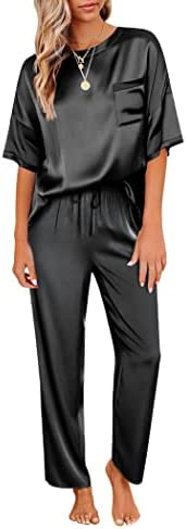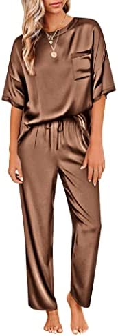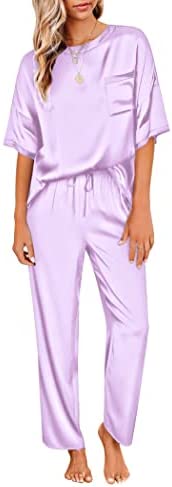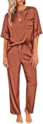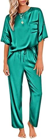 A lightweight two-piece pajama set featuring a pullover tee top and long pants. Soft satin silky fabric, comfy to wear.