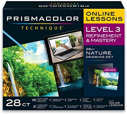 Learn art at your own pace from the comfort of home with Prismacolor Technique. Each Prismacolor Technique set features a unique coupon code for access to digital art lessons you can’t get anywhere else. Instructed by Prismacolor artists, each lesson will teach you how to use the professional-grade art supplies included in the set to create a piece of art you will cherish. The Level 3 Nature Drawing Set is designed for those who have built up some skill and confidence in art. You’ll learn how to take your skills to the next level by recreating any landscape or nature photo using reference grids. The set features Prismacolor colored pencils with rich cores for smooth color laydown and an artist roll case so you can store and carry your art tools. You’ll also receive graphite pencils, a clear reference grid overlay, a colorless blender, an eraser, a drawing pad, a mini sharpener, a drawing template with grid, a set of instructions, and hours of online content to learn at your convenience!