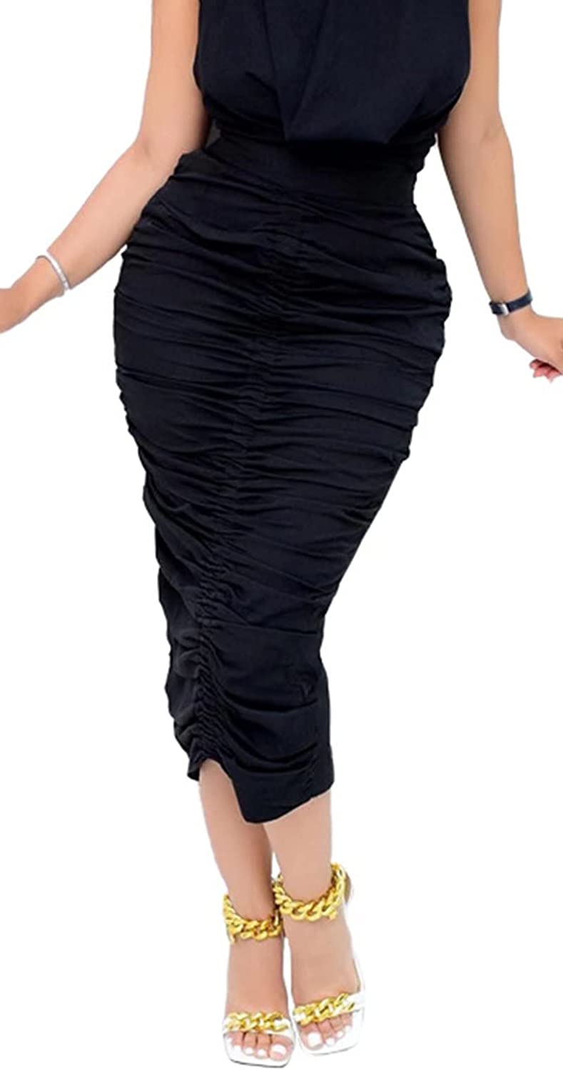 • Womens Elegant Ruched Maxi Skirts Solid Ruffle High Waist Casual Pencil Bodycon Midi Mid-Calf Skirts High Waist Vintage Dress