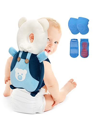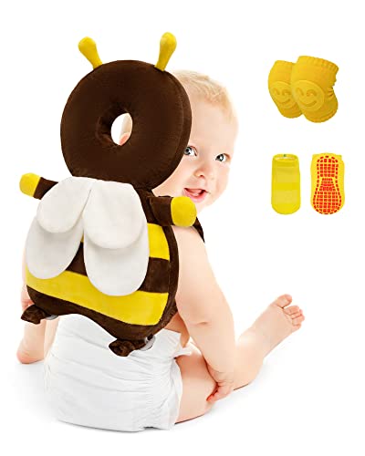 Baby Head Protector Cushion Toddler Head Protection Pillow Baby Backpack with Knee Pads&Anti-Slip Socks (Bee - Crystal Velvet)